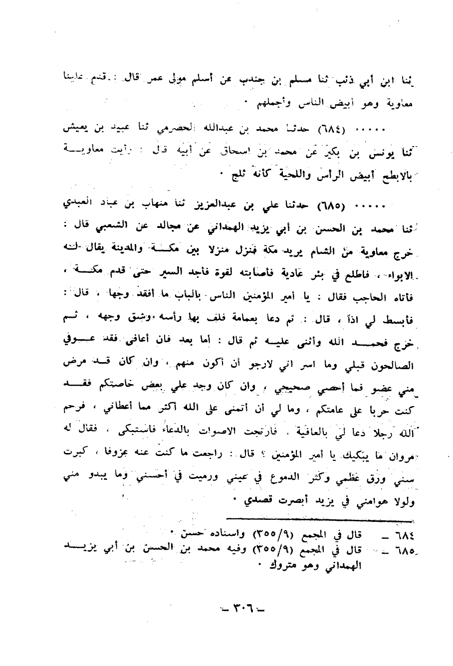685 - حَدَّثَنَا عَلِيُّ بْنُ عَبْدِ الْعَزِيزِ، ثنا مِنْهَابُ بْنُ عَبَّادٍ الْعَبْدِيُّ، ثنا مُحَمَّدُ بْنُ الْحَسَنِ بْنِ أَبِي يَزِيدَ الْهَمْدَانِيُّ، عَنْ مُجَالِدٍ، عَنِ الشَّعْبِيِّ، قَالَ: خَرَجَ مُعَاوِيَةُ مِنَ الشَّامِ يُرِيدُ مَكَّةَ، فَنَزَلَ مَنْزِلًا بَيْنَ مَكَّةَ وَالْمَدِينَةِ يُقَالُ لَهُ الْأَبْوَاءِ، فَاطَّلَعَ فِي بِئْرٍ عَادِيَّةٍ فَأَصَابَتْهُ لَقْوَةٌ، فَأَجَدَّ السَّيْرَ حَتَّى قَدِمَ مَكَّةَ فَأَتَاهُ الْحَاجِبُ، فَقَالَ: يَا أَمِيرَ الْمُؤْمِنِينَ النَّاسُ بِالْبَابِ مَا أَفْقِدُ وَجْهًا، قَالَ: فَأَبْسِطْ لِي إِذًا قَالَ: ثُمَّ دَعَا بِعِمَامَةٍ فَلَفَّ بِهَا رَأْسَهُ وَشَقَّ وَجْهَهُ، ثُمَّ خَرَجَ فَحَمِدَ اللهَ وَأَثْنَى عَلَيْهِ، ثُمَّ قَالَ: «§أَمَّا بَعْدُ فَإِنْ أُعَافَ فَقَدْ عُوفِيَ الصَّالِحُونَ قَبْلِي، وَمَا أُسِرُّ أَنِّي لَأَرْجُو أَنْ أَكُونَ مِنْهُمْ، وَإِنْ كَانَ مَرِضَ مِنِّي عُضْوٌ فَمَا أُحْصِي صَحِيحِي، وَإِنْ كَانَ وَجِدَ عَلِيَّ بَعْضُ خَاصَّتِكُمْ فَقَدْ كُنْتُ حَرْبًا عَلَى عَامَّتِكُمْ، وَمَا لِي أَنْ أَتَمَنَّى عَلَى اللهِ أَكْثَرَ مِمَّا أَعْطَانِي، فَرَحِمَ اللهُ رَجُلًا دَعَا لِي بِالْعَافِيَةِ» ، فَارْتَجَّتِ الْأَصْوَاتُ بِالدُّعَاءِ فَاسْتَبْكَى، فَقَالَ لَهُ مَرْوَانُ: مَا يُبْكِيكَ يَا أَمِيرَ الْمُؤْمِنِينَ؟، قَالَ: رَاجَعْتُ مَا كُنْتُ عَنْهُ عَزُوفًا، كَبِرَتْ سِنِّي، وَرَقَّ عَظْمِي، وَكَثُرَ الدُّمُوعُ فِي عَيْنِي، وَرُمِيتُ فِي أَحْسَنِي وَمَا يَبْدُو مِنِّي وَلَوْلَا هَوًى مِنِّي فِي يَزِيدَ أَبْصَرْتُ قَصْدِي