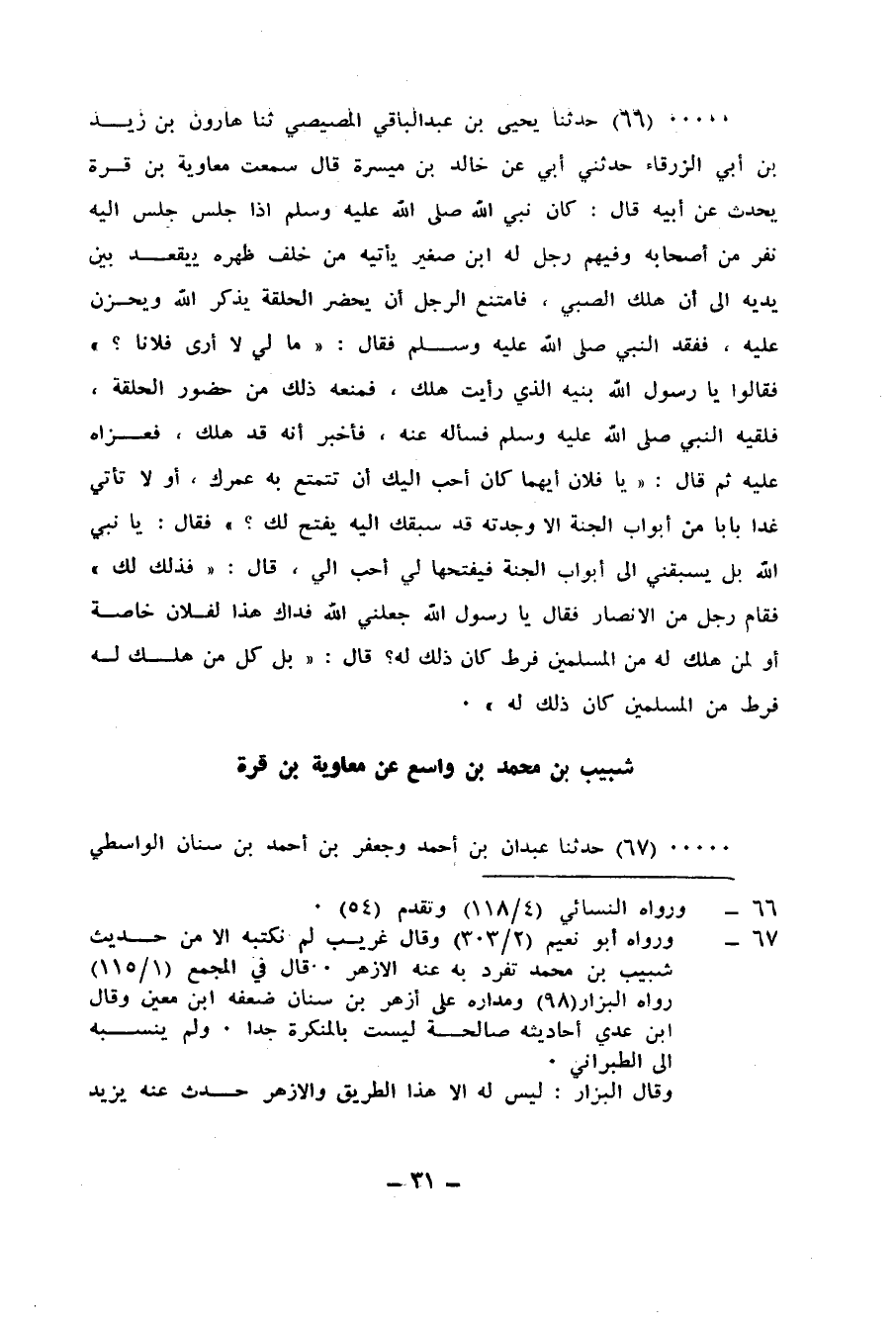 66 - حَدَّثَنَا يَحْيَى بْنُ عَبْدِ الْبَاقِي الْمِصِّيصِيُّ، ثنا هَارُونُ بْنُ زَيْدِ بْنِ أَبِي الزَّرْقَاءِ، حَدَّثَنِي أَبِي، عَنْ خَالِدِ بْنِ مَيْسَرَةَ، قَالَ: سَمِعْتُ مُعَاوِيَةَ بْنَ قُرَّةَ، يُحَدِّثُ عَنْ أَبِيهِ، قَالَ: كَانَ نَبِيُّ اللهِ صَلَّى اللهُ عَلَيْهِ وَسَلَّمَ إِذَا جَلَسَ جَلَسَ إِلَيْهِ نَفَرٌ مِنْ أَصْحَابِهِ، وَفِيهِمْ رَجُلٌ لَهُ ابْنٌ صَغِيرٌ يَأْتِيَهِ مِنْ خَلْفِ ظَهْرِهِ يَقْعُدُ بَيْنَ يَدَيْهِ، إِلَى أَنْ هَلَكَ الصَّبِيُّ فَامْتَنَعَ الرَّجُلُ أَنْ يَحْضُرَ الْحَلْقَةَ يَذْكُرُ اللهَ وَيَحْزَنُ عَلَيْهِ، فَفَقَدَهُ النَّبِيُّ صَلَّى اللهُ عَلَيْهِ وَسَلَّمَ، فَقَالَ: «§مَا لِي لَا أَرَى فُلَانًا؟» ، فَقَالُوا: يَا رَسُولَ اللهِ بُنَيُّهُ الَّذِي رَأَيْتَ هَلَكَ فَمَنَعَهُ ذَلِكَ مِنْ حُضُورِ الْحَلْقَةِ، فَلَقِيَهُ النَّبِيُّ صَلَّى اللهُ عَلَيْهِ وَسَلَّمَ، فَسَأَلَهُ عَنْهُ، فَأُخْبِرَ أَنَّهُ قَدْ هَلَكَ، فَعَزَّاهُ عَلَيْهِ، ثُمَّ قَالَ: " يَا فُلَانُ أَيُّهُمَا كَانَ أَحَبَّ إِلَيْكَ: أَنْ تَتَمَتَّعَ بِهِ عُمُرَكَ أَوْ لَا تَأْتِي غَدًا بَابًا مِنْ أَبْوَابِ الْجَنَّةِ إِلَّا وَجَدْتَهُ قَدْ سَبَقَكَ إِلَيْهِ يَفْتَحُ لَكَ "، فَقَالَ: يَا نَبِيَّ اللهِ بَلْ يَسْبِقُنِي إِلَى أَبْوَابِ الْجَنَّةِ فَيَفْتَحُهَا لِي أَحَبُّ إِلَيَّ، قَالَ: «فَذَلِكَ لَكَ» ، فَقَامَ رَجُلٌ مِنَ الْأَنْصَارِ، فَقَالَ: يَا رَسُولَ اللهِ جَعَلَنِي اللهُ فِدَاكَ، هَذَا لِفُلَانٍ خَاصَّةً أَوْ لِمَنْ هَلَكَ لَهُ مِنَ الْمُسْلِمِينَ فَرَطٌ كَانَ ذَلِكَ لَهُ؟، قَالَ: «بَلْ كُلُّ مَنْ هَلَكَ لَهُ فَرَطٌ مِنَ الْمُسْلِمِينَ كَانَ ذَلِكَ لَهُ»