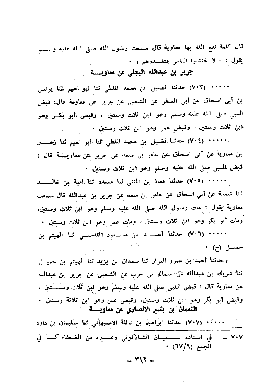 703 - حَدَّثَنَا فُضَيْلُ بْنُ مُحَمَّدٍ الْمَلْطِيُّ، ثنا أَبُو نُعَيْمٍ، ثنا يُونُسُ بْنُ أَبِي إِسْحَاقَ، عَنْ أَبِي السَّفَرِ، عَنِ الشَّعْبِيِّ، عَنْ جَرِيرٍ، عَنْ مُعَاوِيَةَ، قَالَ: «§قُبِضَ النَّبِيُّ صَلَّى اللهُ عَلَيْهِ وَسَلَّمَ وَهُوَ ابْنُ ثَلَاثٍ وَسِتِّينَ، وَقُبِضَ أَبُو بَكْرٍ وَهُوَ ابْنُ ثَلَاثٍ وَسِتِّينَ، وَقُبِضَ عُمَرُ وَهُوَ ابْنُ ثَلَاثٍ وَسِتِّينَ»