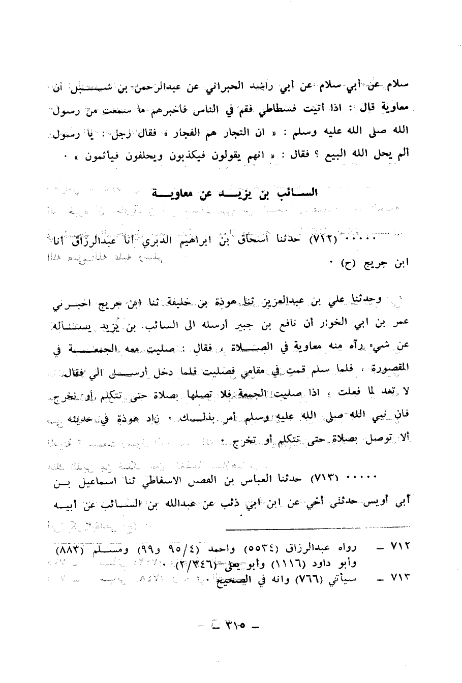 712 - حَدَّثَنَا إِسْحَاقُ بْنُ إِبْرَاهِيمَ الدَّبَرِيُّ، أَنَا عَبْدُ الرَّزَّاقِ، أَنَا ابْنُ جُرَيْجٍ، ح وَحَدَّثَنَا عَلِيُّ بْنُ عَبْدِ الْعَزِيزِ، ثنا هَوْذَةُ بْنُ خَلِيفَةَ، ثنا ابْنُ جُرَيْجٍ، أَخْبَرَنِي عُمَرُ بْنِ أَبِي الْخُوَارِ، أَنَّ نَافِعَ بْنَ جُبَيْرٍ، أَرْسَلَهُ إِلَى السَّائِبِ بْنِ يَزِيدَ، يَسْأَلُهُ عَنْ شَيْءٍ رَآهُ مِنْهُ مُعَاوِيَةُ فِي الصَّلَاةِ، فَقَالَ: صَلَّيْتُ مَعَهُ الْجُمُعَةَ فِي الْمَقْصُورَةِ، فَلَمَّا سَلَّمَ قُمْتُ فِي مَقَامِي فَصَلَّيْتُ، فَلَمَّا دَخَلَ أَرْسَلَ إِلَيَّ فَقَالَ: «لَا تَعُدْ لِمَا فَعَلْتَ، §إِذَا صَلَّيْتَ الْجُمُعَةَ فَلَا تَصِلْهَا بِصَلَاةٍ حَتَّى تَتَكَلَّمَ أَوْ تَخْرُجَ، فَإِنَّ نَبِيَّ اللهِ صَلَّى اللهُ عَلَيْهِ وَسَلَّمَ أَمَرَ بِذَلِكَ» . زَادَ هَوْذَةُ فِي حَدِيثِهِ: أَلَّا تُوصَلَ بِصَلَاةٍ حَتَّى تَتَكَلَّمَ أَوْ تَخْرُجَ