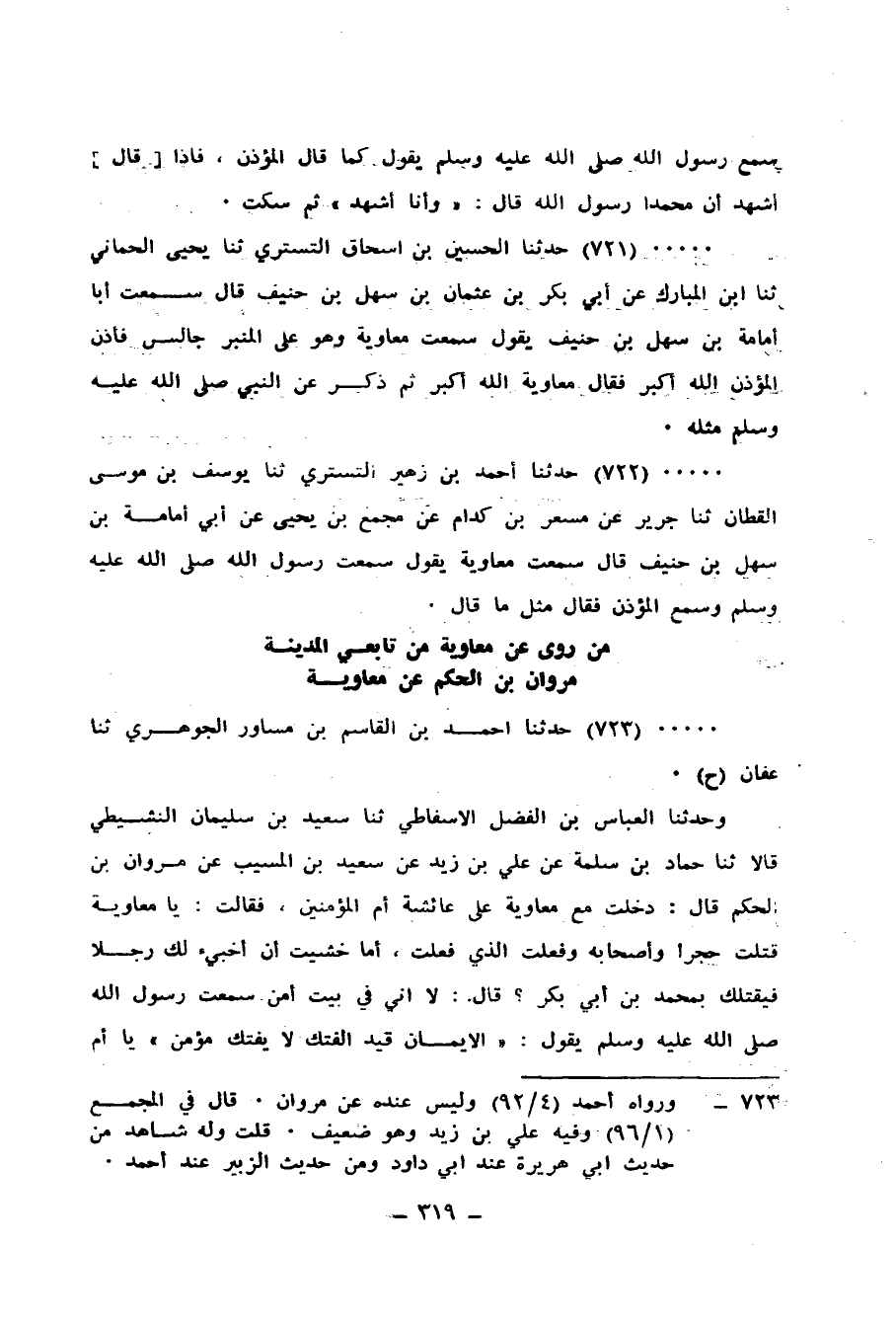 723 - حَدَّثَنَا أَحْمَدُ بْنُ الْقَاسِمِ بْنِ مُسَاوِرٍ الْجَوْهَرِيُّ، ثنا عَفَّانُ، ح وَحَدَّثَنَا الْعَبَّاسُ بْنُ الْفَضْلِ الْأَسْفَاطِيُّ، ثنا سَعِيدُ بْنُ سُلَيْمَانَ النَّشِيطِيُّ، قَالَا: ثنا حَمَّادُ بْنُ سَلَمَةَ، عَنْ عَلِيِّ بْنِ زَيْدٍ، عَنْ سَعِيدِ بْنِ الْمُسَيِّبِ، عَنْ مَرْوَانَ بْنِ الْحَكَمِ، قَالَ: دَخَلْتُ مَعَ مُعَاوِيَةَ عَلَى عَائِشَةَ أُمِّ الْمُؤْمِنِينَ فَقَالَتْ: يَا مُعَاوِيَةُ قَتَلْتَ حَجَرًا وَأَصْحَابَهُ، وَفَعَلْتَ الَّذِي فَعَلْتَ، أَمَا خَشِيتَ أَنْ أُخَبِّئَ لَكَ رَجُلًا فَيَقْتُلَكَ بِمُحَمَّدِ بْنِ أَبِي بَكْرٍ؟، قَالَ: لَا، إِنِّي فِي بَيْتٍ آمَنٍ، سَمِعْتُ رَسُولَ اللهِ صَلَّى اللهُ عَلَيْهِ وَسَلَّمَ يَقُولُ: «§الْإِيمَانُ قَيَّدَ الْفَتْكَ، لَا يَفْتِكُ مُؤْمِنٌ» ، يَا أُمَّ الْمُؤْمِنِينَ كَيْفَ أَنَا فِي حَاجَاتِكِ وَرُسُلِكِ وَأَمْرِكِ؟، قَالَتْ: صَالِحٌ، قَالَ: فَدَعِينِي وَحَجَرًا حَتَّى نَلْتَقِيَ عِنْدَ اللهِ