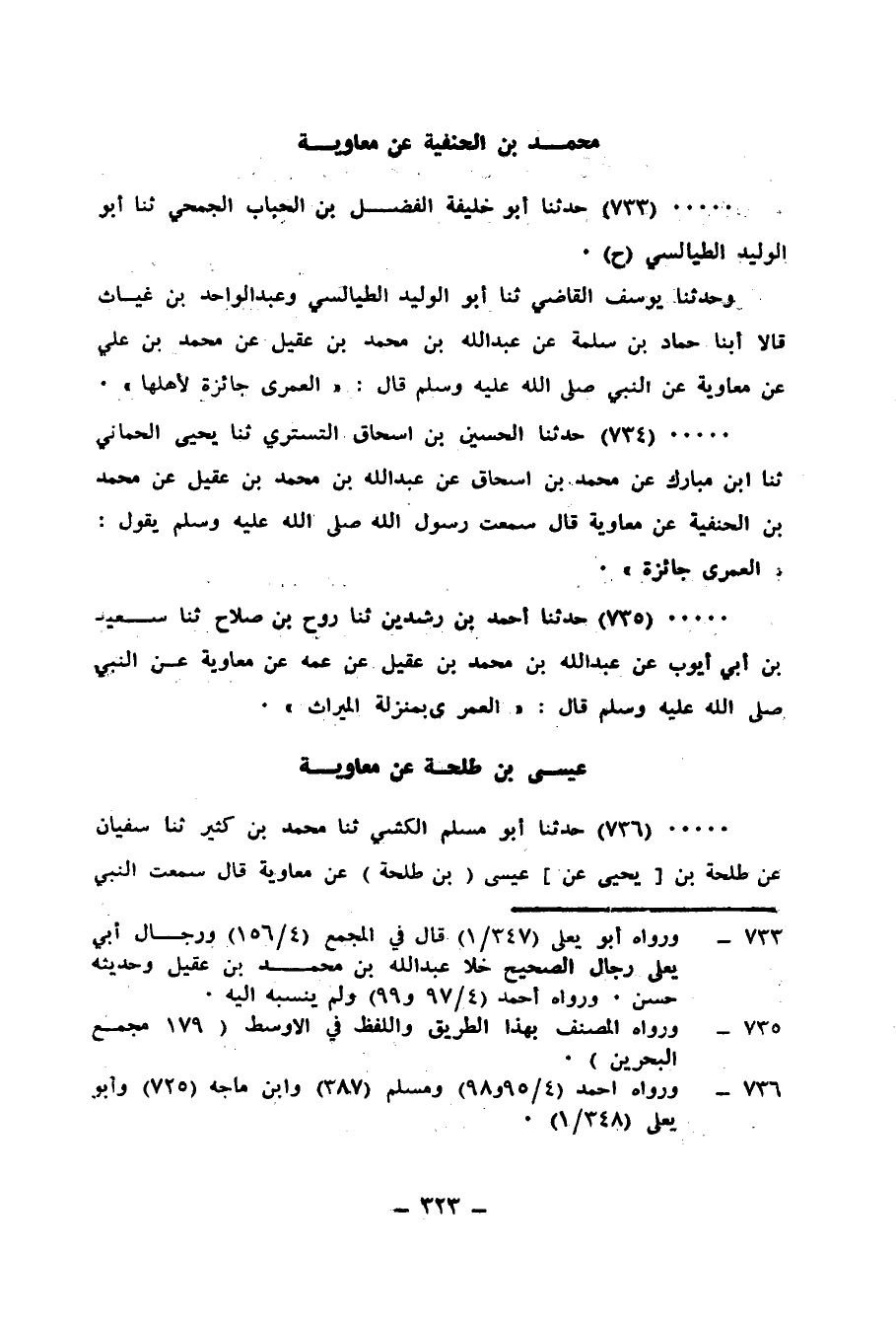 733 - حَدَّثَنَا أَبُو خَلِيفَةَ الْفَضْلُ بْنُ الْحُبَابِ الْجُمَحِيُّ، ثنا أَبُو الْوَلِيدِ الطَّيَالِسِيُّ، ح وَحَدَّثَنَا يُوسُفُ الْقَاضِي، ثنا أَبُو الْوَلِيدِ الطَّيَالِسِيُّ، وَعَبْدُ الْوَاحِدِ بْنُ غِيَاثٍ، قَالَا: أَنْبَأَ حَمَّادُ بْنُ سَلَمَةَ، عَنْ عَبْدِ اللهِ بْنِ مُحَمَّدِ بْنِ عَقِيلٍ، عَنْ مُحَمَّدِ بْنِ عَلِيٍّ، عَنْ مُعَاوِيَةَ، عَنِ النَّبِيِّ صَلَّى اللهُ عَلَيْهِ وَسَلَّمَ قَالَ: «§الْعُمْرَى جَائِزَةٌ لِأَهْلِهَا»