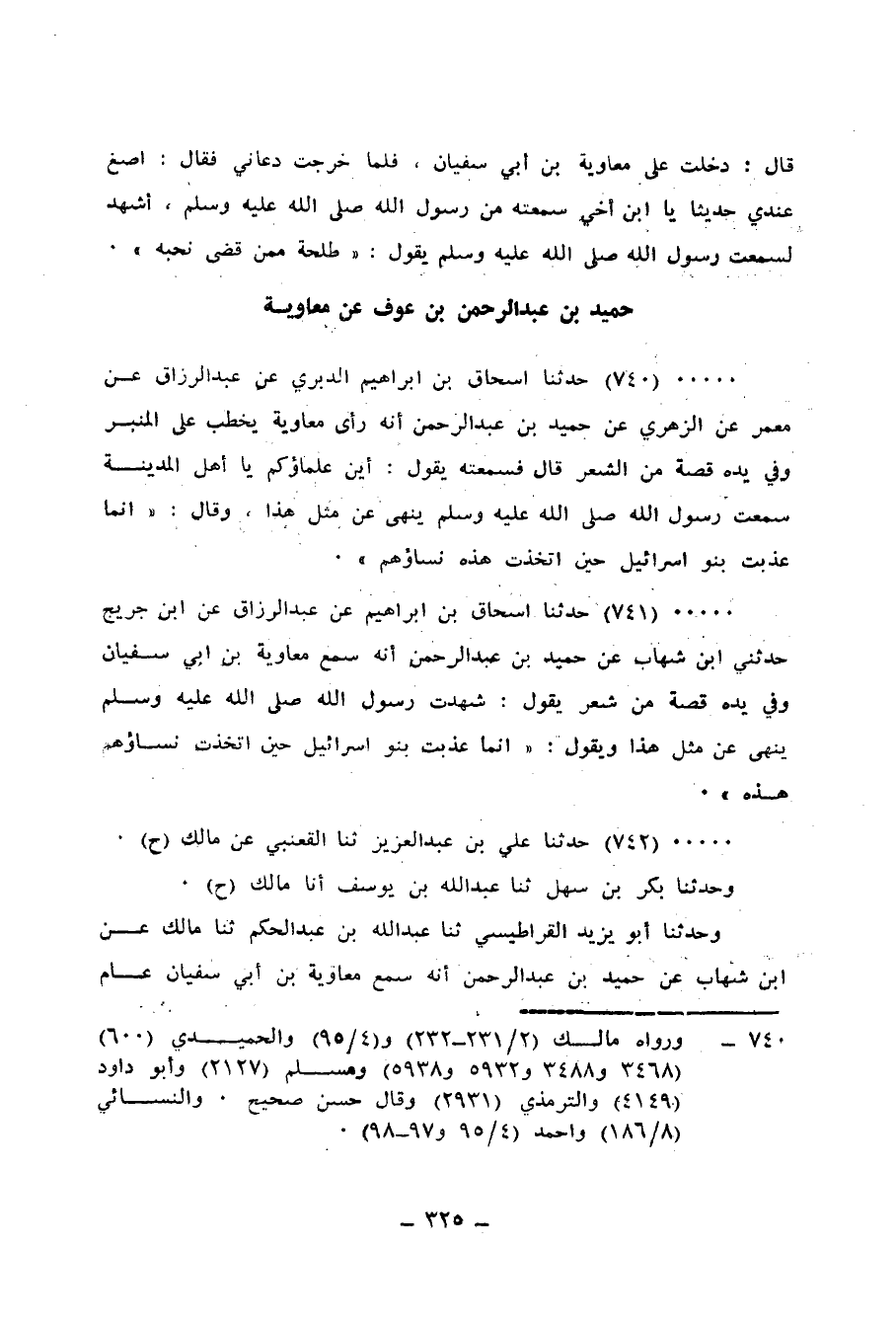740 - حَدَّثَنَا إِسْحَاقُ بْنُ إِبْرَاهِيمَ الدَّبَرِيُّ، عَنْ عَبْدِ الرَّزَّاقِ، عَنْ مَعْمَرٍ، عَنِ الزُّهْرِيِّ، عَنْ حُمَيْدِ بْنِ عَبْدِ الرَّحْمَنِ، أَنَّهُ رَأَى مُعَاوِيَةَ يَخْطُبُ عَلَى الْمِنْبَرِ وَفِي يَدِهِ قُصَّةٌ مِنَ الشَّعْرِ، قَالَ: فَسَمِعْتُهُ يَقُولُ: أَيْنَ عُلَمَاؤُكُمْ يَا أَهْلَ الْمَدِينَةِ؟، سَمِعْتُ رَسُولَ اللهِ صَلَّى اللهُ عَلَيْهِ وَسَلَّمَ يَنْهَى عَنْ مِثْلِ هَذَا، وَقَالَ: «إِنَّمَا §عُذِّبَتْ بَنُو إِسْرَائِيلَ حِينَ اتَّخَذَتْ هَذِهِ نِسَاؤُهُمْ»
