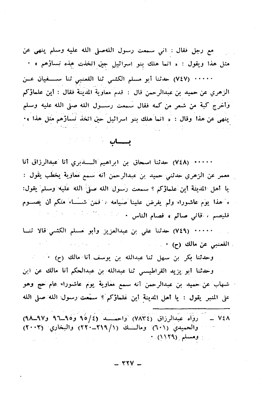 749 - حَدَّثَنَا عَلِيُّ بْنُ عَبْدِ الْعَزِيزِ، وَأَبُو مُسْلِمٍ الْكَشِّيُّ قَالَا: ثنا الْقَعْنَبِيُّ، عَنْ مَالِكٍ، وَحَدَّثَنَا بَكْرُ بْنُ سَهْلٍ، ثنا عَبْدُ اللهِ بْنُ يُوسُفَ، أَنَا مَالِكٌ، ح وَحَدَّثَنَا أَبُو يَزِيدَ الْقَرَاطِيسِيُّ، ثنا عَبْدُ اللهِ بْنُ عَبْدِ الْحَكَمِ، أَنَا مَالِكٌ، عَنِ ابْنِ شِهَابٍ، عَنْ حُمَيْدِ بْنِ عَبْدِ الرَّحْمَنِ: أَنَّهُ سَمِعَ مُعَاوِيَةَ، يَوْمَ عَاشُورَاءَ عَامَ حَجَّ وَهُوَ عَلَى الْمِنْبَرِ يَقُولُ: يَا أَهْلَ الْمَدِينَةِ أَيْنَ عُلَمَاؤُكُمْ؟، سَمِعْتُ رَسُولَ اللهِ صَلَّى اللهُ عَلَيْهِ وَسَلَّمَ يَقُولُ: «إِنَّ» §هَذَا الْيَوْمَ يَوْمُ عَاشُورَاءَ، وَلَمْ يُكْتَبْ عَلَيْكُمْ صِيَامُهُ وَأَنَا صَائِمٌ، فَمَنْ شَاءَ فَلْيَصُمْ وَمَنْ شَاءَ فَلْيُفْطِرْ "