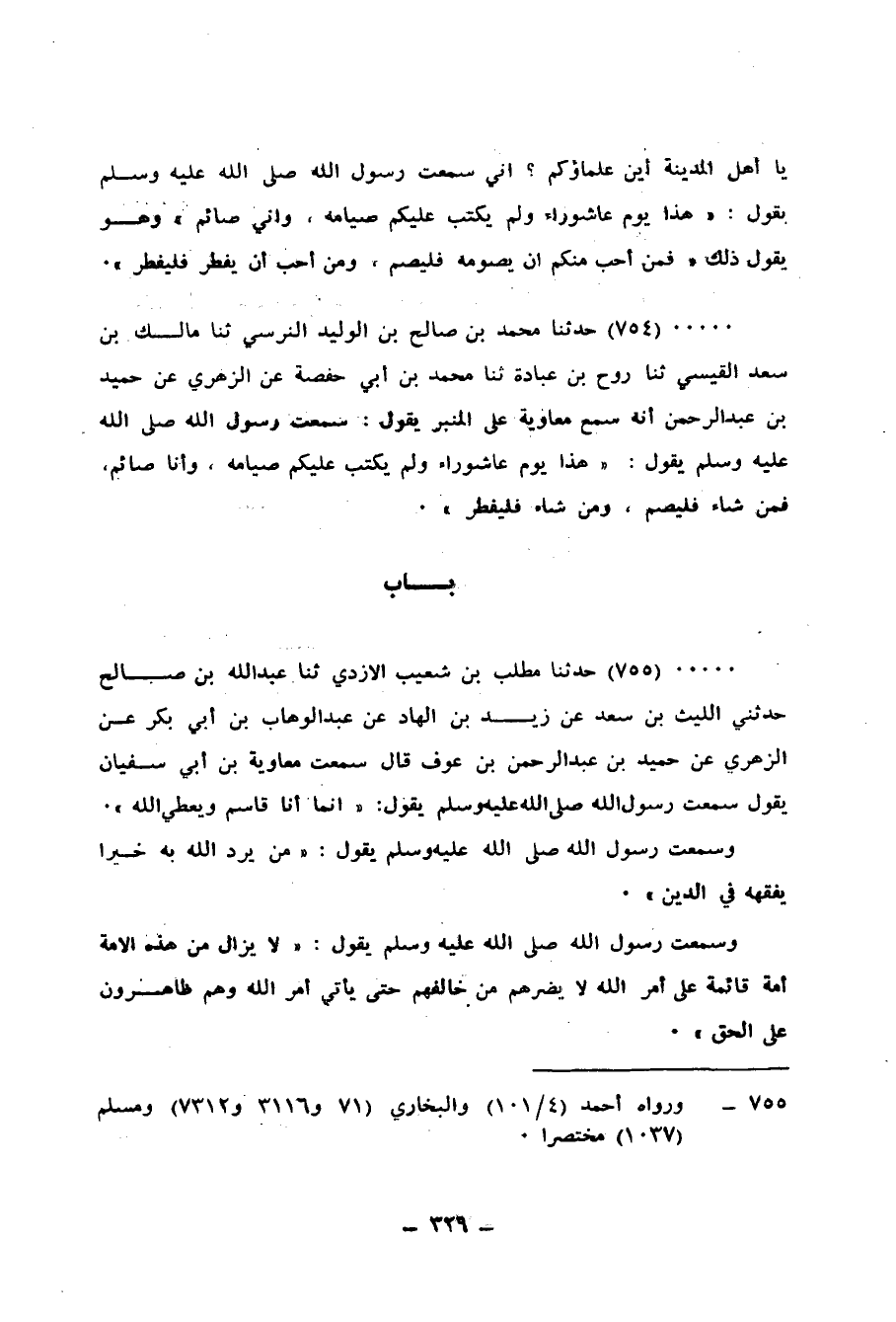 754 - حَدَّثَنَا مُحَمَّدُ بْنُ صَالِحِ بْنِ الْوَلِيدِ النَّرْسِيُّ، ثنا مَالِكُ بْنُ سَعْدٍ الْقَيْسِيُّ، ثنا رَوْحُ بْنُ عُبَادَةَ، ثنا مُحَمَّدُ بْنُ أَبِي حَفْصَةَ، عَنِ الزُّهْرِيِّ، عَنْ حُمَيْدِ بْنِ عَبْدِ الرَّحْمَنِ، أَنَّهُ سَمِعَ مُعَاوِيَةَ، عَلَى الْمِنْبَرِ يَقُولُ: سَمِعْتُ رَسُولَ اللهِ صَلَّى اللهُ عَلَيْهِ وَسَلَّمَ يَقُولُ: «§هَذَا يَوْمُ عَاشُورَاءَ، وَلَمْ يُكْتَبْ عَلَيْكُمْ صِيَامُهُ، وَأَنَا صَائِمٌ، فَمَنْ شَاءَ فَلْيَصُمْ وَمَنْ شَاءَ فَلْيُفْطِرْ»