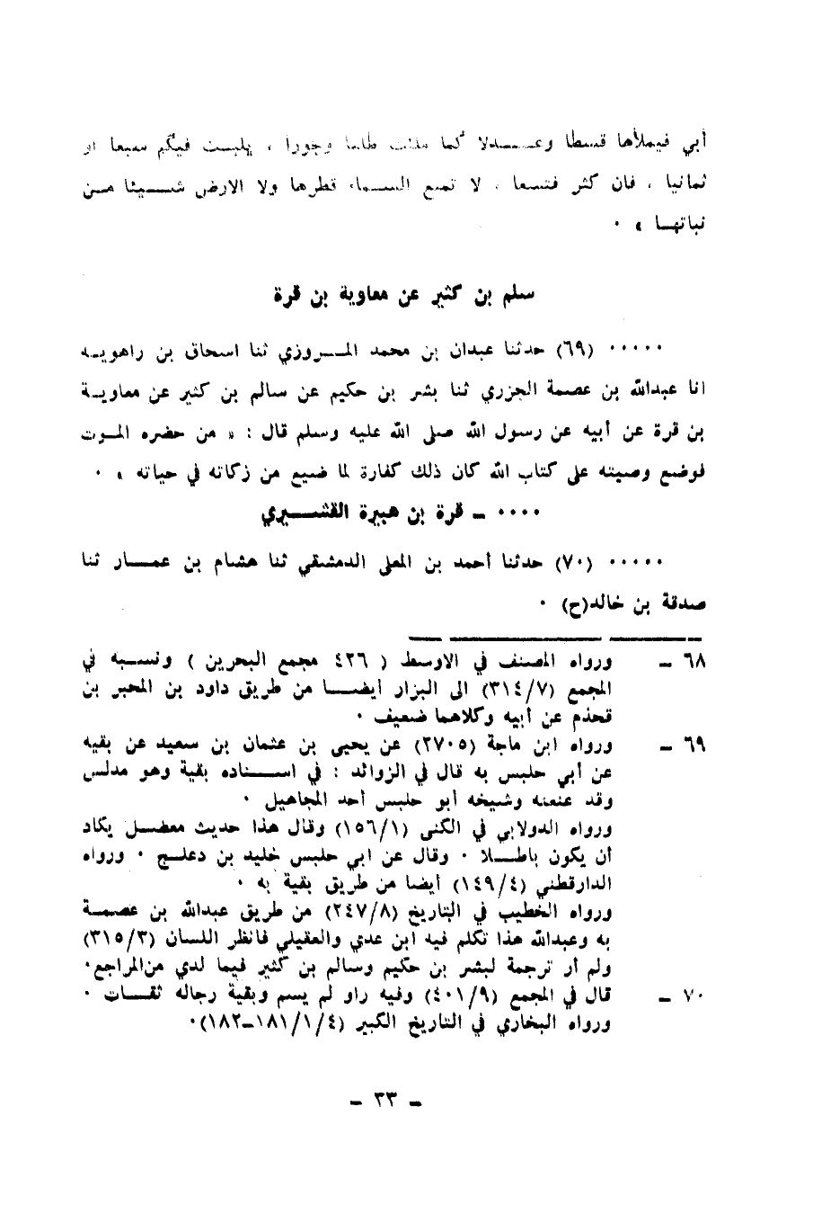 70 - حَدَّثَنَا أَحْمَدُ بْنُ الْمُعَلَّى الدِّمَشْقِيُّ، ثنا هِشَامُ بْنُ عَمَّارٍ، ثنا صَدَقَةُ بْنُ خَالِدٍ، ح وَحَدَّثَنَا الْحُسَيْنُ بْنُ إِسْحَاقَ التُّسْتَرِيُّ، ثنا الْعَبَّاسُ بْنُ الْوَلِيدِ الْخَلَّالُ الدِّمَشْقِيُّ، ثنا عُمَرُ بْنُ عَبْدِ الْوَاحِدِ، كِلَاهُمَا عَنْ عَبْدِ الرَّحْمَنِ بْنِ يَزِيدَ بْنِ جَابِرٍ، ثنا شَيْخٌ بِالسَّاحِلِ، عَنْ رَجُلٍ، مِنْ بَنِي قُشَيْرٍ، يُقَالُ لَهُ: قُرَّةُ بْنُ هُبَيْرَةَ، أَنَّهُ أَتَى النَّبِيَّ صَلَّى اللهُ عَلَيْهِ وَسَلَّمَ، فَقَالَ: إِنَّهُ كَانَ لَنَا أَرْبَابٌ وَرَبَّاتٌ نَعْبُدُهُنَّ مِنْ دُونِ اللهِ، فَدَعَوْنَاهُنَّ فَلَمْ يُجِبْنَ، وَسَأَلْنَاهُنَّ فَلَمْ يُعْطِينَ، فَجِئْنَاكَ فَهَدَانَا اللهُ بِكَ، فَنَحْنُ نَعْبُدُ اللهَ، فَقَالَ رَسُولُ اللهِ صَلَّى اللهُ عَلَيْهِ وَسَلَّمَ: «§أَفْلَحَ مَنْ رُزِقَ لُبًّا»