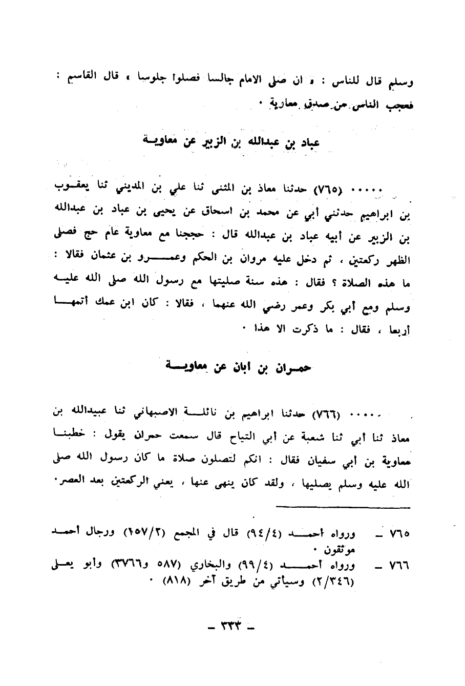 766 - حَدَّثَنَا إِبْرَاهِيمُ بْنُ نَائِلَةَ الْأَصْبَهَانِيُّ، ثنا عُبَيْدُ اللهِ بْنُ مُعَاذٍ، ثنا أَبِي، ثنا شُعْبَةُ، عَنْ أَبِي التَّيَّاحِ، قَالَ: سَمِعْتُ حُمْرَانَ، يَقُولُ: خَطَبَنَا مُعَاوِيَةُ بْنُ أَبِي سُفْيَانَ، فَقَالَ: «§إِنَّكُمْ لَتُصَلُّونَ صَلَاةً مَا كَانَ رَسُولُ اللهِ صَلَّى اللهُ عَلَيْهِ وَسَلَّمَ، يُصَلِّيهَا، وَلَقَدْ كَانَ يَنْهَى عَنْهَا» ، «يَعْنِي الرَّكْعَتَيْنِ بَعْدَ الْعَصْرِ»