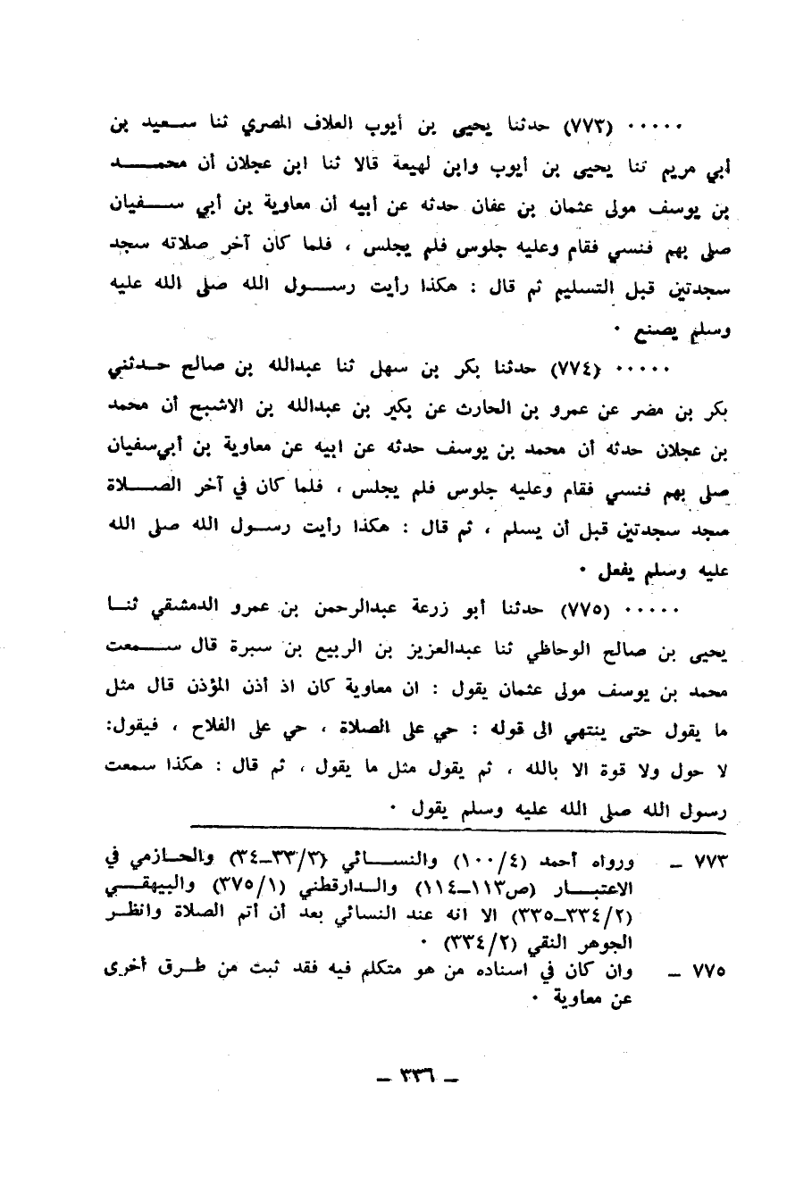773 - حَدَّثَنَا يَحْيَى بْنُ أَيُّوبَ الْعَلَّافُ الْمِصْرِيُّ، ثنا سَعِيدُ بْنُ أَبِي مَرْيَمَ، ثنا يَحْيَى بْنُ أَيُّوبَ، وَابْنُ لَهِيعَةَ، قَالَا: ثنا ابْنُ عَجْلَانَ، أَنَّ مُحَمَّدَ بْنَ يُوسُفَ مَوْلَى عُثْمَانَ بْنِ عَفَّانَ حَدَّثَهُ، عَنْ أَبِيهِ أَنَّ مُعَاوِيَةَ بْنَ أَبِي سُفْيَانَ، §صَلَّى بِهِمْ فَنَسِيَ فَقَامَ وَعَلَيْهِ جُلُوسٌ فَلَمْ يَجْلِسْ، فَلَمَّا كَانَ آخِرُ صَلَاتِهِ سَجَدَ سَجْدَتَيْنِ قَبْلَ التَّسْلِيمِ، ثُمَّ قَالَ: «هَكَذَا رَأَيْتُ رَسُولَ اللهِ صَلَّى اللهُ عَلَيْهِ وَسَلَّمَ يَصْنَعُ»