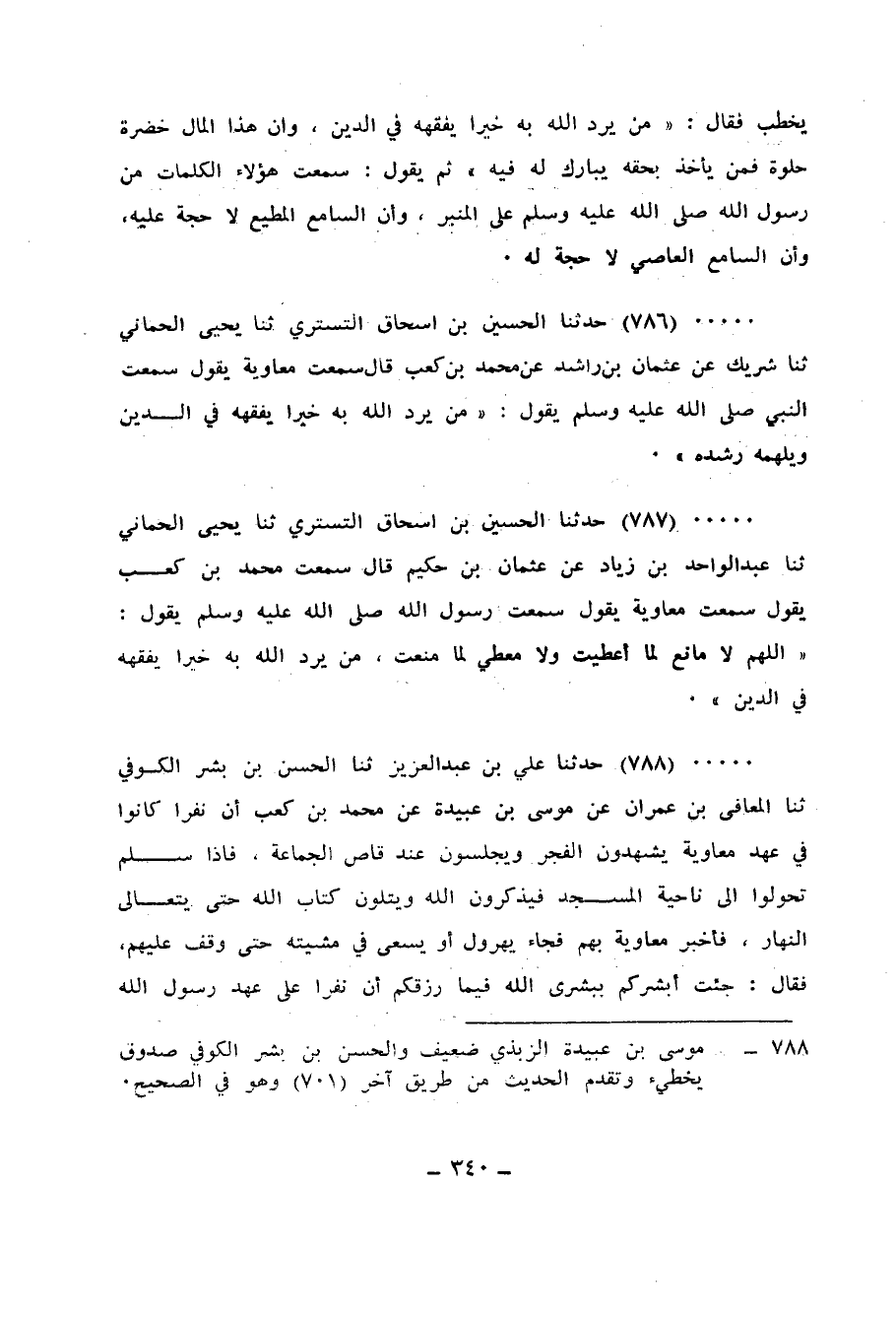 786 - حَدَّثَنَا الْحُسَيْنُ بْنُ إِسْحَاقَ التُّسْتَرِيُّ، ثنا يَحْيَى الْحِمَّانِيُّ، ثنا شَرِيكٌ، عَنْ عُثْمَانَ بْنِ رَاشِدٍ، عَنْ مُحَمَّدِ بْنِ كَعْبٍ، قَالَ: سَمِعْتُ مُعَاوِيَةَ يَقُولُ: سَمِعْتُ النَّبِيَّ صَلَّى اللهُ عَلَيْهِ وَسَلَّمَ يَقُولُ: «§مَنْ يُرِدِ اللهُ بِهِ خَيْرًا يُفَقِّهْهُ فِي الدِّينِ، وَيُلْهِمُهُ رُشْدَهُ»