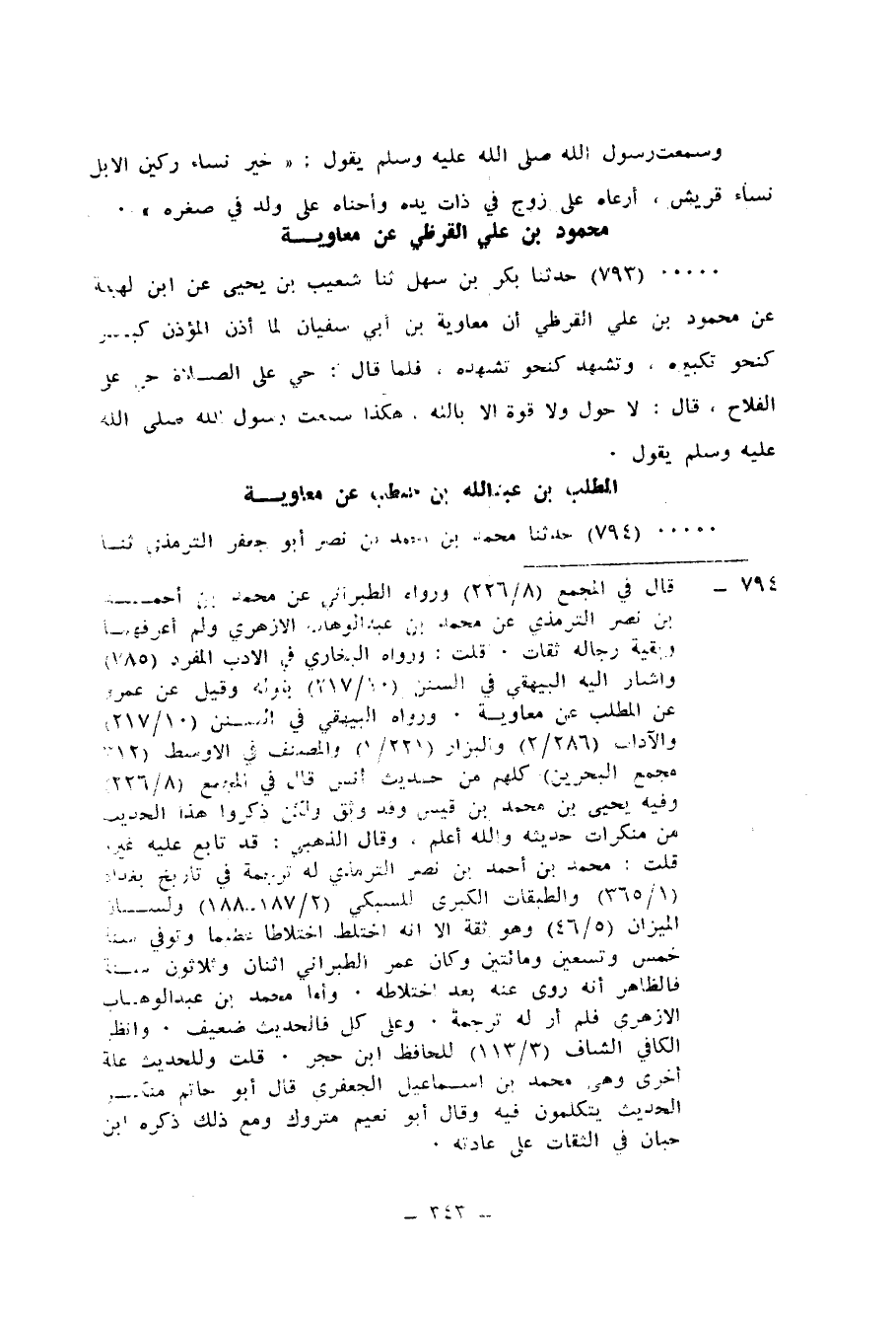 793 - حَدَّثَنَا بَكْرُ بْنُ سَهْلٍ، ثنا شُعَيْبُ بْنُ يَحْيَى، عَنِ ابْنِ لَهِيعَةَ، عَنْ مَحْمُودِ بْنِ عَلِيٍّ الْقُرَظِيِّ أَنَّ مُعَاوِيَةَ بْنَ أَبِي سُفْيَانَ، " §لَمَّا أَذَّنَ الْمُؤَذِّنُ كَبَّرَ كَنَحْوِ تَكْبِيرِهِ، وَتَشَهَّدَ كَنَحْوِ تَشَهُّدِهِ، فَلَمَّا قَالَ: حَيَّ عَلَى الصَّلَاةِ، حَيَّ عَلَى الْفَلَاحِ، قَالَ: «لَا حَوْلَ وَلَا قُوَّةَ إِلَّا بِاللهِ، هَكَذَا سَمِعْتُ رَسُولَ اللهِ صَلَّى اللهُ عَلَيْهِ وَسَلَّمَ يَقُولُ»