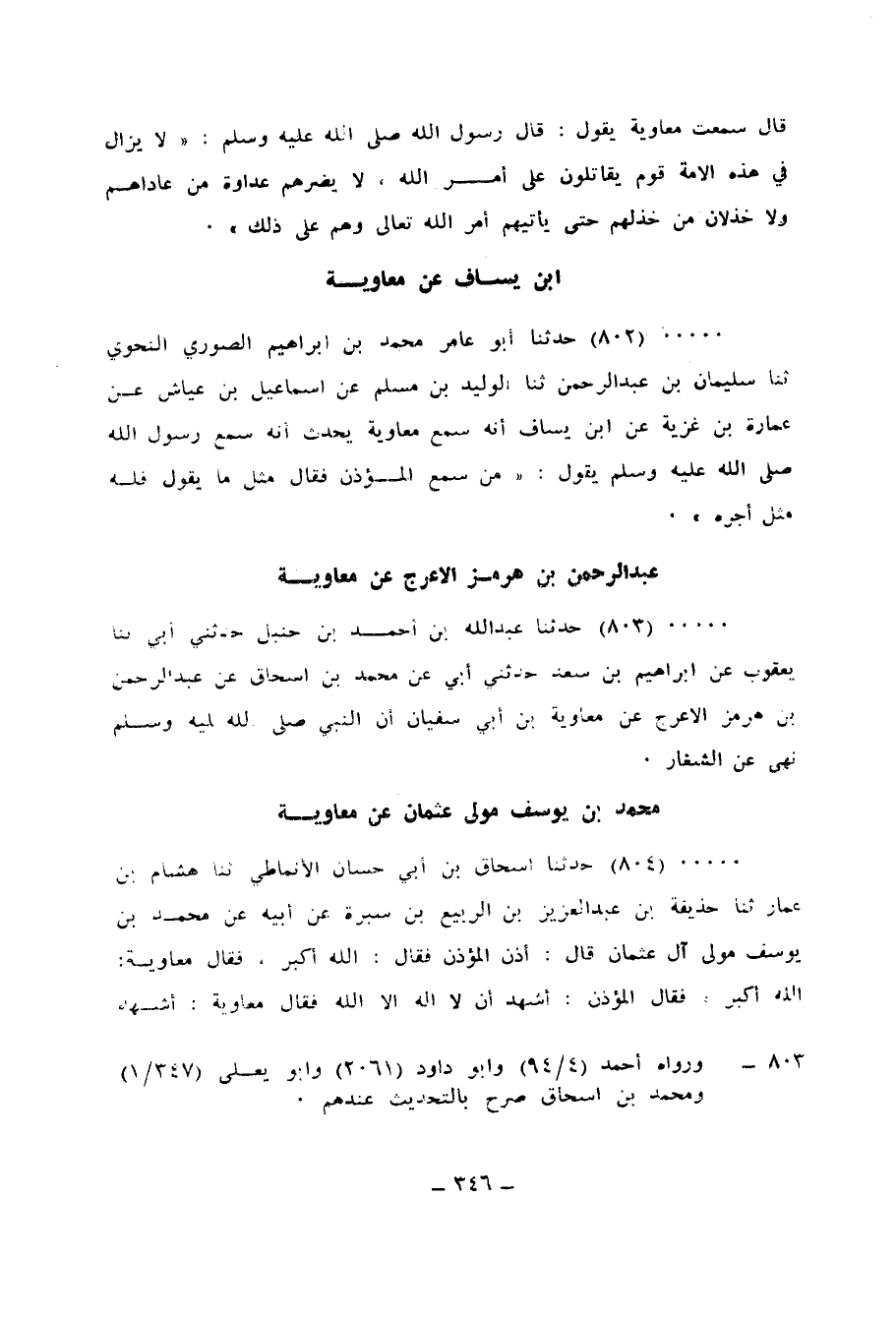 804 - حَدَّثَنَا إِسْحَاقُ بْنُ أَبِي حَسَّانٍ الْأَنْمَاطِيُّ، ثنا هِشَامُ بْنُ عَمَّارٍ، ثنا حُذَيْفَةُ بْنُ عَبْدِ الْعَزِيزِ بْنِ الرَّبِيعِ بْنِ سَبْرَةَ، عَنْ أَبِيهِ، عَنْ مُحَمَّدِ بْنِ يُوسُفَ، مَوْلَى آلِ عُثْمَانَ، قَالَ: " §أَذَّنَ الْمُؤَذِّنُ فَقَالَ: اللهُ أَكْبَرُ، فَقَالَ مُعَاوِيَةُ: «اللهُ أَكْبَرُ» ، فَقَالَ الْمُؤَذِّنُ: أَشْهَدُ أَنْ لَا إِلَهَ إِلَّا اللهُ، فَقَالَ مُعَاوِيَةُ: «أَشْهَدُ أَنْ لَا إِلَهَ إِلَّا اللهُ» ، فَقَالَ الْمُؤَذِّنُ: أَشْهَدُ أَنَّ مُحَمَّدًا رَسُولُ اللهِ، فَقَالَ مُعَاوِيَةُ: «أَشْهَدُ أَنَّ مُحَمَّدًا رَسُولُ اللهِ» ، ثُمَّ قَالَ مُعَاوِيَةُ: «هَكَذَا سَمِعْتُ رَسُولَ اللهِ صَلَّى اللهُ عَلَيْهِ وَسَلَّمَ»