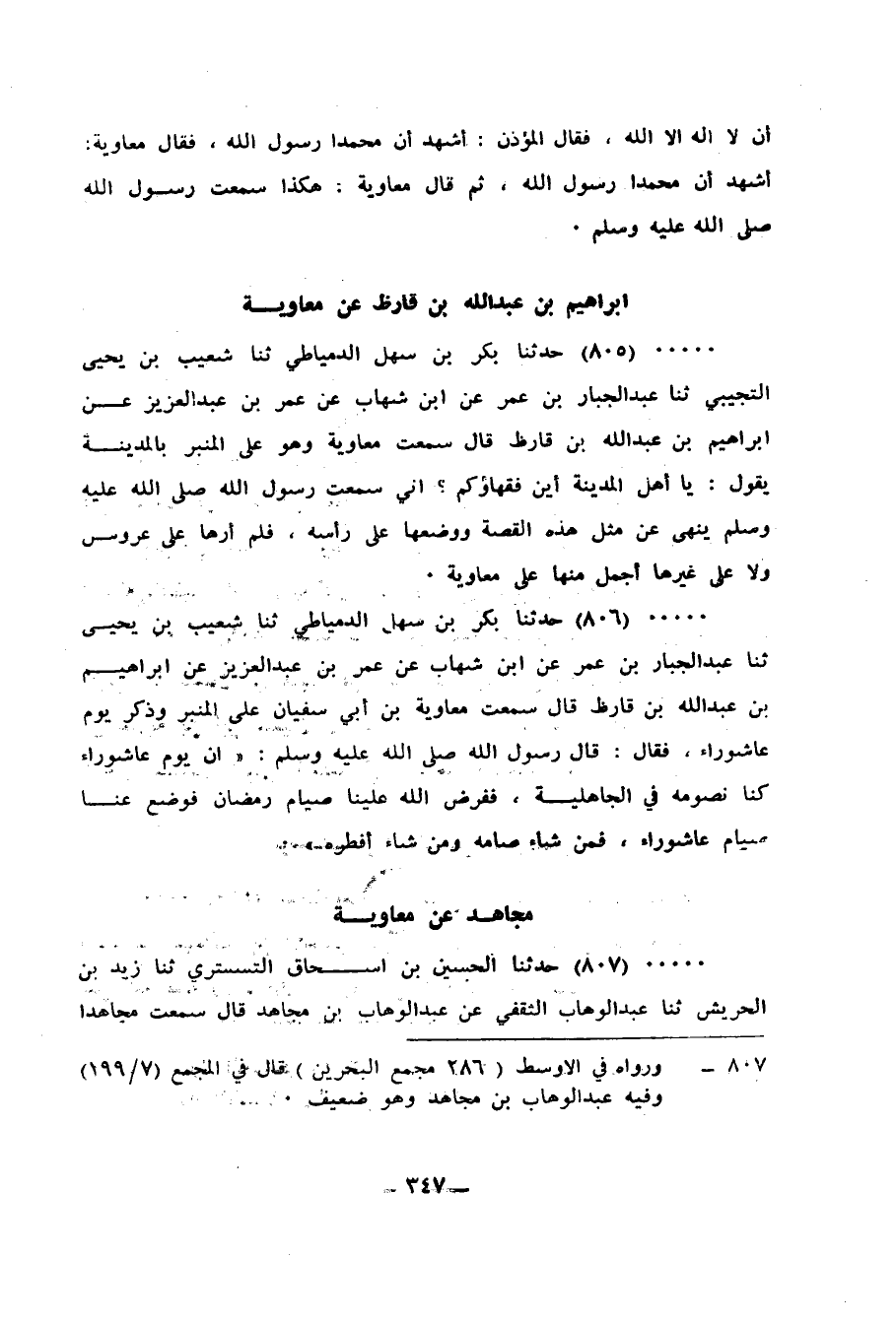 806 - حَدَّثَنَا بَكْرُ بْنُ سَهْلٍ الدِّمْيَاطِيُّ، ثنا شُعَيْبُ بْنُ يَحْيَى، ثنا عَبْدُ الْجَبَّارِ بْنُ عُمَرَ، عَنِ ابْنِ شِهَابٍ، عَنْ عُمَرَ بْنِ عَبْدِ الْعَزِيزِ، عَنْ إِبْرَاهِيمَ بْنِ عَبْدِ اللهِ بْنِ قَارِظٍ، قَالَ: سَمِعْتُ مُعَاوِيَةَ بْنَ أَبِي سُفْيَانَ، عَلَى الْمِنْبَرِ وَذَكَرَ يَوْمَ عَاشُورَاءَ فَقَالَ: قَالَ رَسُولُ اللهِ صَلَّى اللهُ عَلَيْهِ وَسَلَّمَ: «إِنَّ §يَوْمَ عَاشُورَاءَ كُنَّا نَصُومُهُ فِي الْجَاهِلِيَّةِ فَفَرَضَ اللهُ عَلَيْنَا صِيَامَ رَمَضَانَ، فَوَضَعَ عَنَّا صِيَامَ عَاشُورَاءَ، فَمَنْ شَاءَ صَامَهُ وَمَنْ شَاءَ أَفْطَرَهُ»
