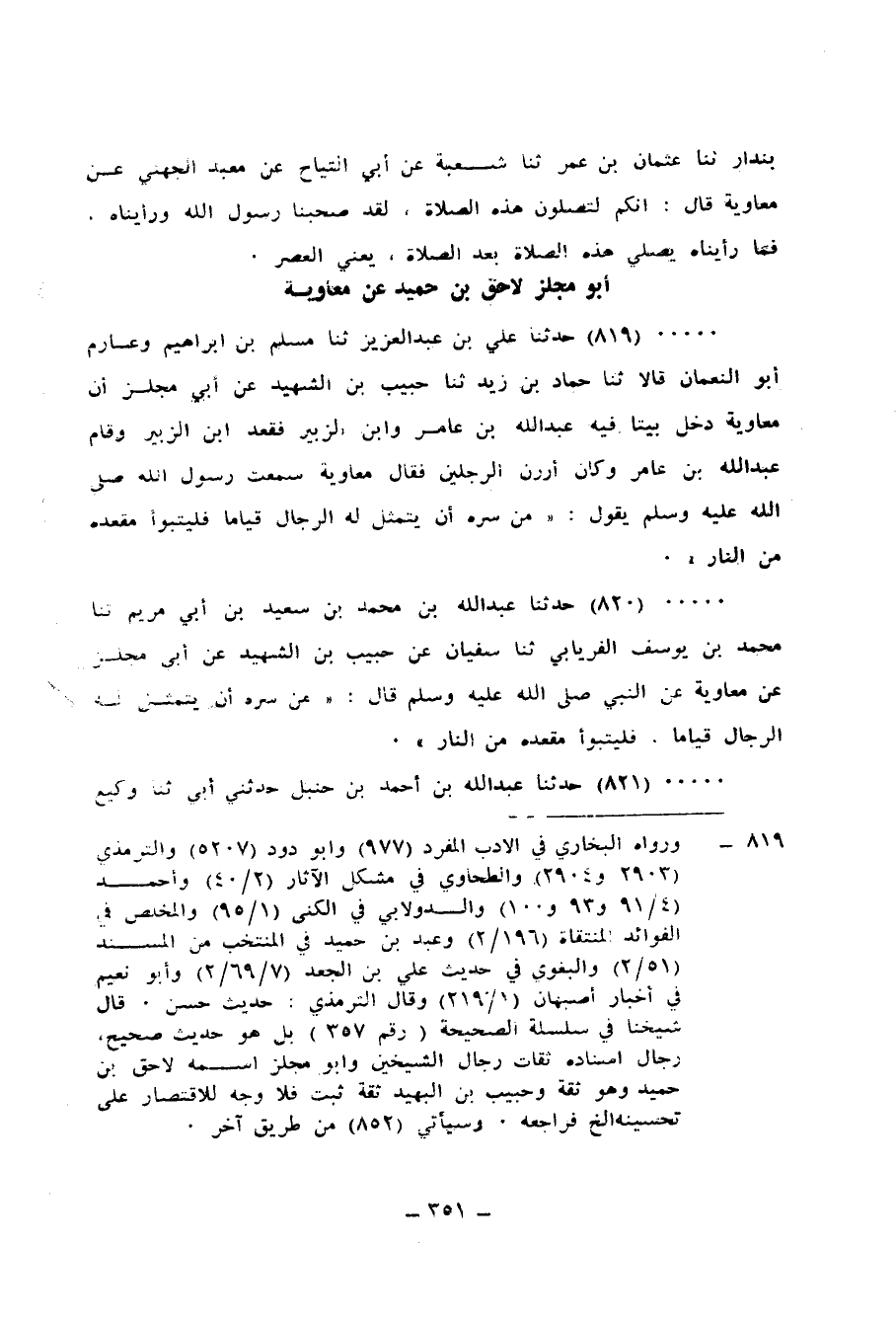 819 - حَدَّثَنَا عَلِيُّ بْنُ عَبْدِ الْعَزِيزِ، ثنا مُسْلِمُ بْنُ إِبْرَاهِيمَ، وَعَارِمٌ أَبُو النُّعْمَانِ، قَالَا: ثنا حَمَّادُ بْنُ زَيْدٍ، ثنا حَبِيبُ بْنُ الشَّهِيدِ، عَنْ أَبِي مِجْلَزٍ، أَنَّ مُعَاوِيَةَ، دَخَلَ بَيْتًا فِيهِ عَبْدُ اللهِ بْنُ عَامِرٍ، وَابْنُ الزُّبَيْرِ، فَقَعَدَ ابْنُ الزُّبَيْرِ وَقَامَ عَبْدُ اللهِ بْنُ عَامِرٍ، وَكَانَ أَرْزَنَ الرَّجُلَيْنِ، فَقَالَ مُعَاوِيَةُ: سَمِعْتُ رَسُولَ اللهِ صَلَّى اللهُ عَلَيْهِ وَسَلَّمَ يَقُولُ: «§مَنْ سَرَّهُ أَنْ يَتَمَثَّلَ لَهُ الرِّجَالُ قِيَامًا فَلْيَتَبَوَّأْ مَقْعَدَهُ مِنَ النَّارِ»