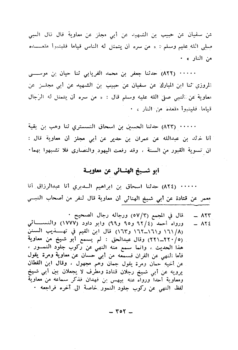 822 - حَدَّثَنَا جَعْفَرُ بْنُ مُحَمَّدٍ الْفِرْيَابِيُّ، ثنا حَيَّانُ بْنُ مُوسَى الْمَرْوَزِيُّ، ثنا ابْنُ الْمُبَارَكِ، عَنْ سُفْيَانَ، عَنْ حَبِيبِ بْنِ الشَّهِيدِ، عَنْ أَبِي مِجْلَزٍ، عَنْ مُعَاوِيَةَ، عَنِ النَّبِيِّ صَلَّى اللهُ عَلَيْهِ وَسَلَّمَ، قَالَ: «§مَنْ سَرَّهُ أَنْ يَتَمَثَّلَ لَهُ الرِّجَالُ قِيَامًا فَلْيَتَبَوَّأْ مَقْعَدَهُ مِنَ النَّارِ»