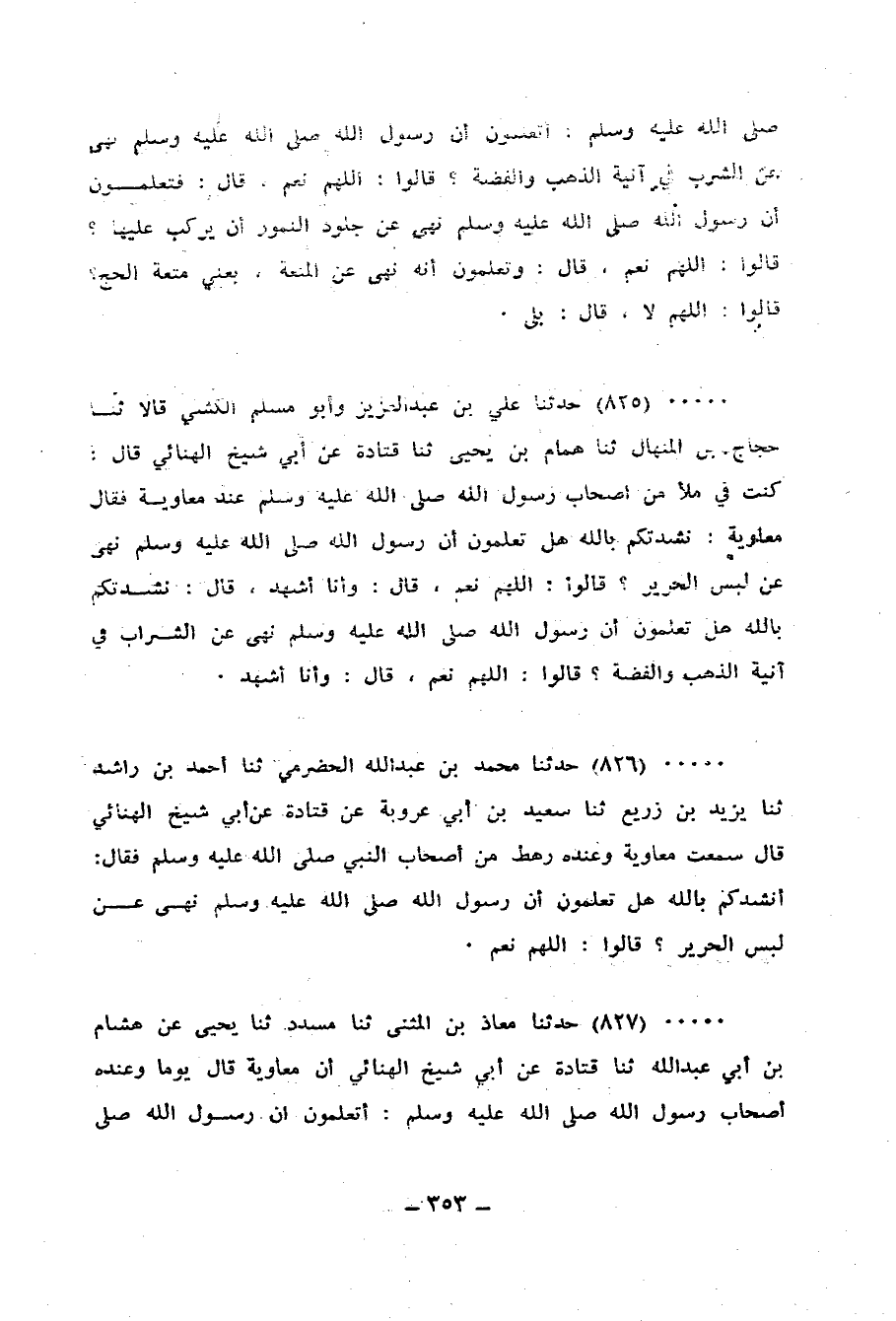 826 - حَدَّثَنَا مُحَمَّدُ بْنُ عَبْدِ اللهِ الْحَضْرَمِيُّ، ثنا أَحْمَدُ بْنُ رَاشِدٍ، ثنا يَزِيدُ بْنُ زُرَيْعٍ، ثنا سَعِيدُ بْنُ أَبِي عَرُوبَةَ، عَنْ قَتَادَةَ، عَنْ أَبِي شَيْخٍ الْهُنَائِيُّ، قَالَ: سَمِعْتُ مُعَاوِيَةَ، وَعِنْدَهُ رَهْطٌ مِنْ أَصْحَابِ النَّبِيِّ صَلَّى اللهُ عَلَيْهِ وَسَلَّمَ، فَقَالَ: أَنْشُدُكُمْ بِاللهِ هَلْ تَعْلَمُونَ أَنَّ رَسُولَ اللهِ صَلَّى اللهُ عَلَيْهِ وَسَلَّمَ " §نَهَى عَنْ لِبْسِ الْحَرِيرِ؟، قَالُوا: اللهُمَّ نَعَمْ "