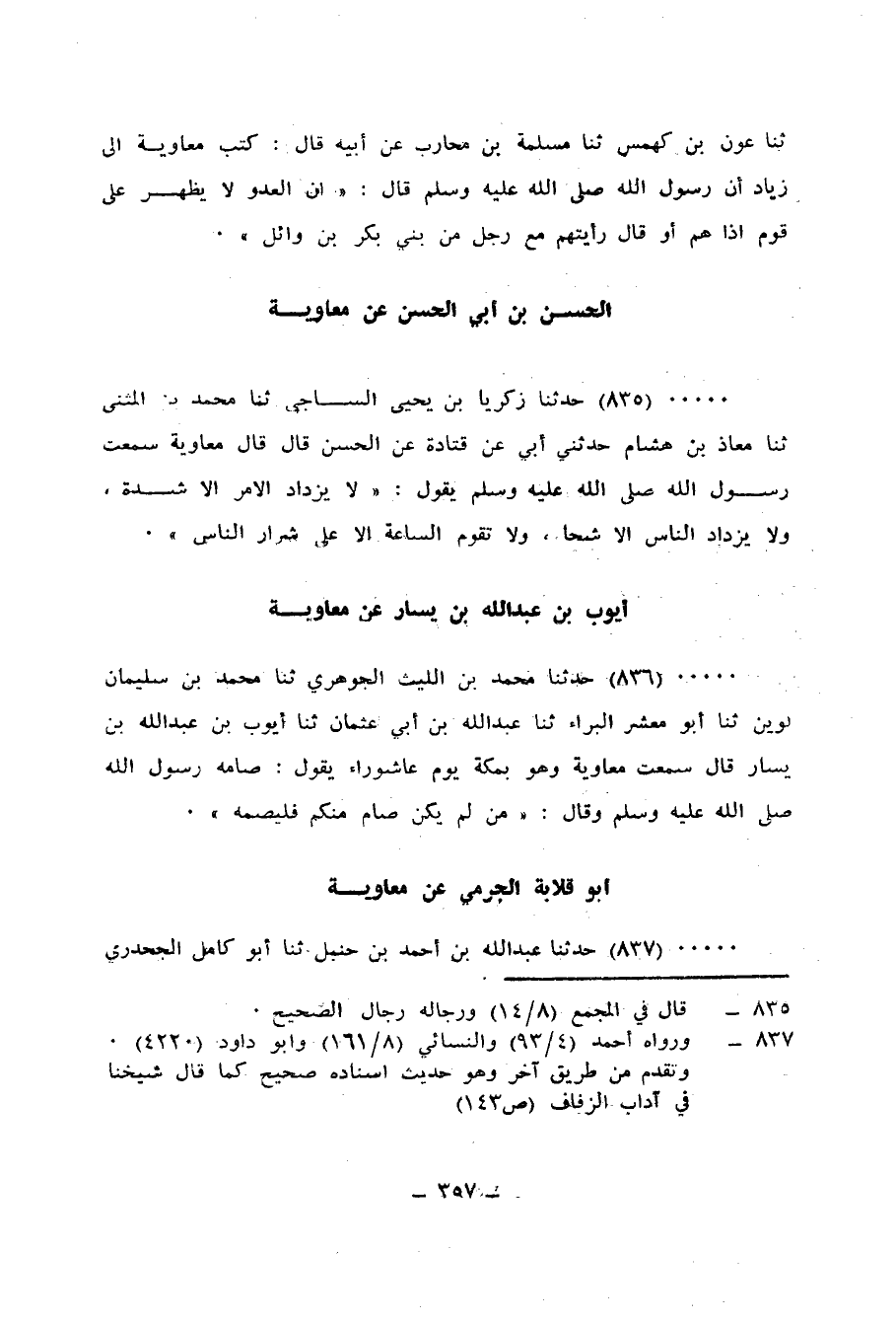 837 - حَدَّثَنَا عَبْدُ اللهِ بْنُ أَحْمَدَ بْنِ حَنْبَلٍ، ثنا أَبُو كَامِلٍ الْجَحْدَرِيُّ، ثنا سُفْيَانُ بْنُ حَبِيبٍ، عَنْ خَالِدٍ الْحَذَّاءِ، عَنْ أَبِي قِلَابَةَ، عَنْ مُعَاوِيَةَ، قَالَ: «§نَهَى رَسُولُ اللهِ صَلَّى اللهُ عَلَيْهِ وَسَلَّمَ عَنْ لِبْسِ الذَّهَبِ إِلَّا مُقَطَّعًا، وَعَنْ رُكُوبِ النِّمَارِ»