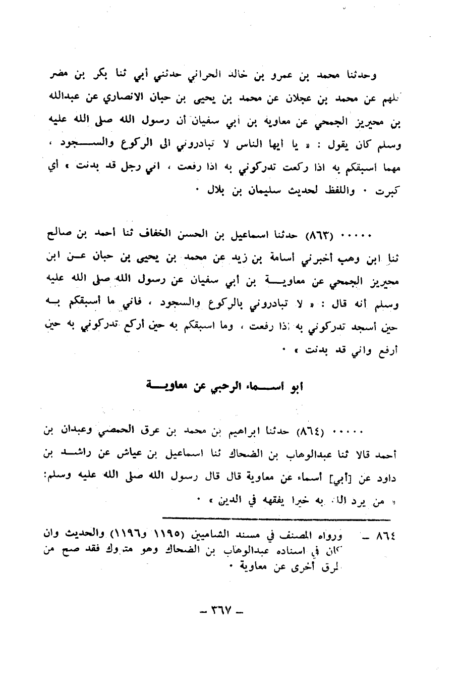 863 - حَدَّثَنَا إِسْمَاعِيلُ بْنُ الْحَسَنِ الْخَفَّافُ، ثنا أَحْمَدُ بْنُ صَالِحٍ، ثنا ابْنُ وَهْبٍ، أَخْبَرَنِي أُسَامَةُ بْنُ زَيْدٍ، عَنْ مُحَمَّدِ بْنِ يَحْيَى بْنِ حَبَّانَ، عَنِ ابْنِ مُحَيْرِيزٍ الْجُمَحِيِّ، عَنْ مُعَاوِيَةَ بْنِ أَبِي سُفْيَانَ، عَنْ رَسُولِ اللهِ صَلَّى اللهُ عَلَيْهِ وَسَلَّمَ أَنَّهُ قَالَ: «§لَا تُبَادِرُونِي بِالرُّكُوعِ والسُّجُودِ فَإِنِّي مَا أَسْبِقُكُمْ بِهِ حِينَ أَسْجُدُ تُدْرِكُونِي بِهِ إِذَا رَفَعْتُ، وَمَا أَسْبِقُكُمْ بِهِ حِينَ أَرْكَعُ تُدْرِكُونِي بِهِ حِينَ أَرْفَعُ، وَإِنِّي قَدْ بَدُنْتُ»