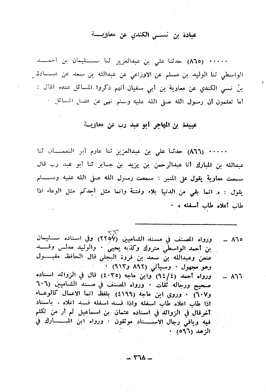 866 - حَدَّثَنَا عَلِيُّ بْنُ عَبْدِ الْعَزِيزِ، ثنا عَارِمٌ أَبُو النُّعْمَانِ، ثنا عَبْدُ اللهِ بْنُ الْمُبَارَكِ، أَنَا عَبْدُ الرَّحْمَنِ بْنُ يَزِيدَ بْنِ جَابِرٍ، ثنا أَبُو عَبْدِ رَبٍّ، قَالَ: سَمِعْتُ مُعَاوِيَةَ، يَقُولُ عَلَى الْمِنْبَرِ: سَمِعْتُ رَسُولَ اللهِ صَلَّى اللهُ عَلَيْهِ وَسَلَّمَ يَقُولُ: «إِنَّمَا §بَقِيَ مِنَ الدُّنْيَا بَلَاءٌ وَفِتْنَةٌ، وَإِنَّمَا مَثَلُ أَحَدِكُمْ مِثْلُ الْوِعَاءِ إِذَا طَابَ أَعْلَاهُ طَابَ أَسْفَلُهُ»