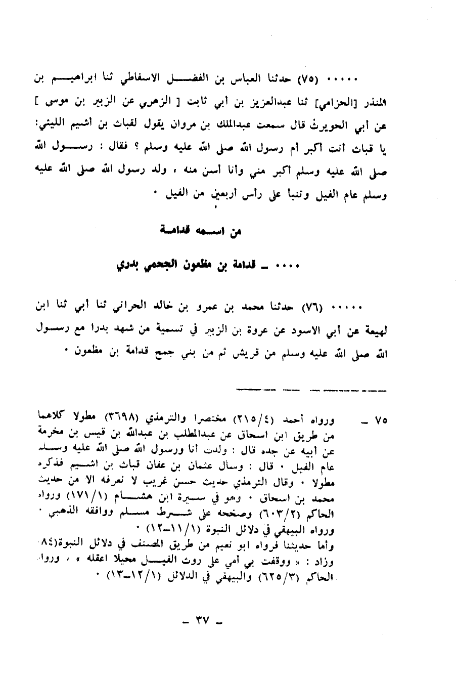 75 - حَدَّثَنَا الْعَبَّاسُ بْنُ الْفَضْلِ الْأَسْفَاطِيُّ، ثنا إِبْرَاهِيمُ بْنُ الْمُنْذِرِ الْحِزَامِيُّ، ثنا عَبْدُ الْعَزِيزِ بْنُ أَبِي ثَابِتٍ الزُّهْرِيُّ، عَنِ الزُّبَيْرِ بْنِ مُوسَى، عَنْ أَبِي الْحُوَيْرِثِ، قَالَ: سَمِعْتُ عَبْدَ الْمَلِكِ بْنَ مَرْوَانَ، يَقُولُ لِقَبَاثِ بْنِ أَشْيَمَ اللَّيْثِيِّ: يَا قَبَاثُ أَنْتَ أَكْبَرُ أَمْ رَسُولُ اللهِ صَلَّى اللهُ عَلَيْهِ وَسَلَّمَ؟، فَقَالَ: «§رَسُولُ اللهِ صَلَّى اللهُ عَلَيْهِ وَسَلَّمَ أَكْبَرُ مِنِّي، وَأَنَا أَسَنُّ مِنْهُ، وُلِدَ رَسُولُ اللهِ صَلَّى اللهُ عَلَيْهِ وَسَلَّمَ عَامَ الْفِيلِ، وَتَنَبَّأَ عَلَى رَأْسِ أَرْبَعِينَ مِنَ الْفِيلِ»