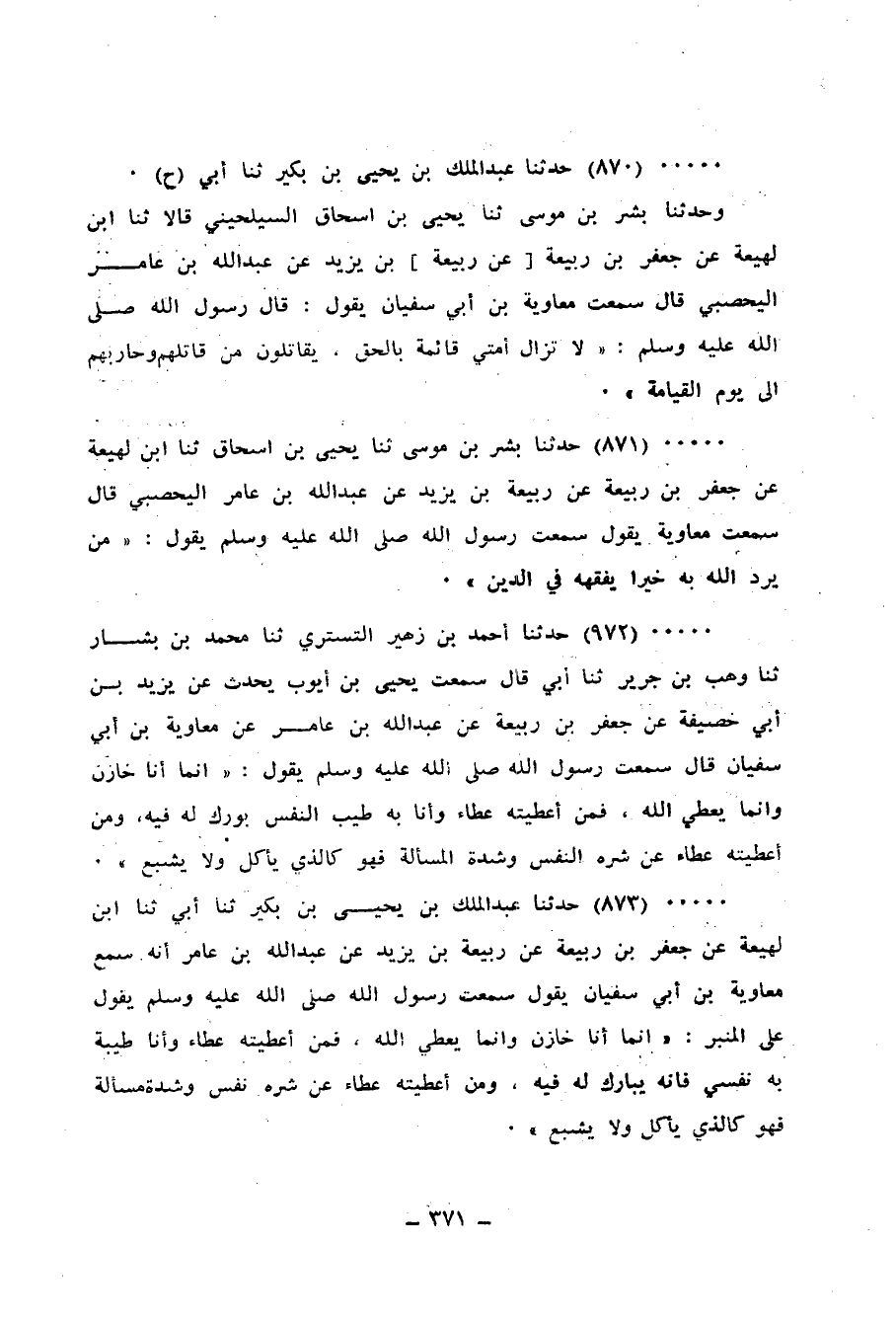 871 - حَدَّثَنَا بِشْرُ بْنُ مُوسَى، ثنا يَحْيَى بْنُ إِسْحَاقَ، ثنا ابْنُ لَهِيعَةَ، عَنْ جَعْفَرِ بْنِ رَبِيعَةَ، عَنْ رَبِيعَةَ بْنِ يَزِيدَ، عَنْ عَبْدِ اللهِ بْنِ عَامِرٍ الْيَحْصِبِيِّ، قَالَ: سَمِعْتُ مُعَاوِيَةَ يَقُولُ: سَمِعْتُ رَسُولَ اللهِ صَلَّى اللهُ عَلَيْهِ وَسَلَّمَ يَقُولُ: «§مَنْ يُرِدِ اللهُ بِهِ خَيْرًا يُفَقِّهْهُ فِي الدِّينِ»