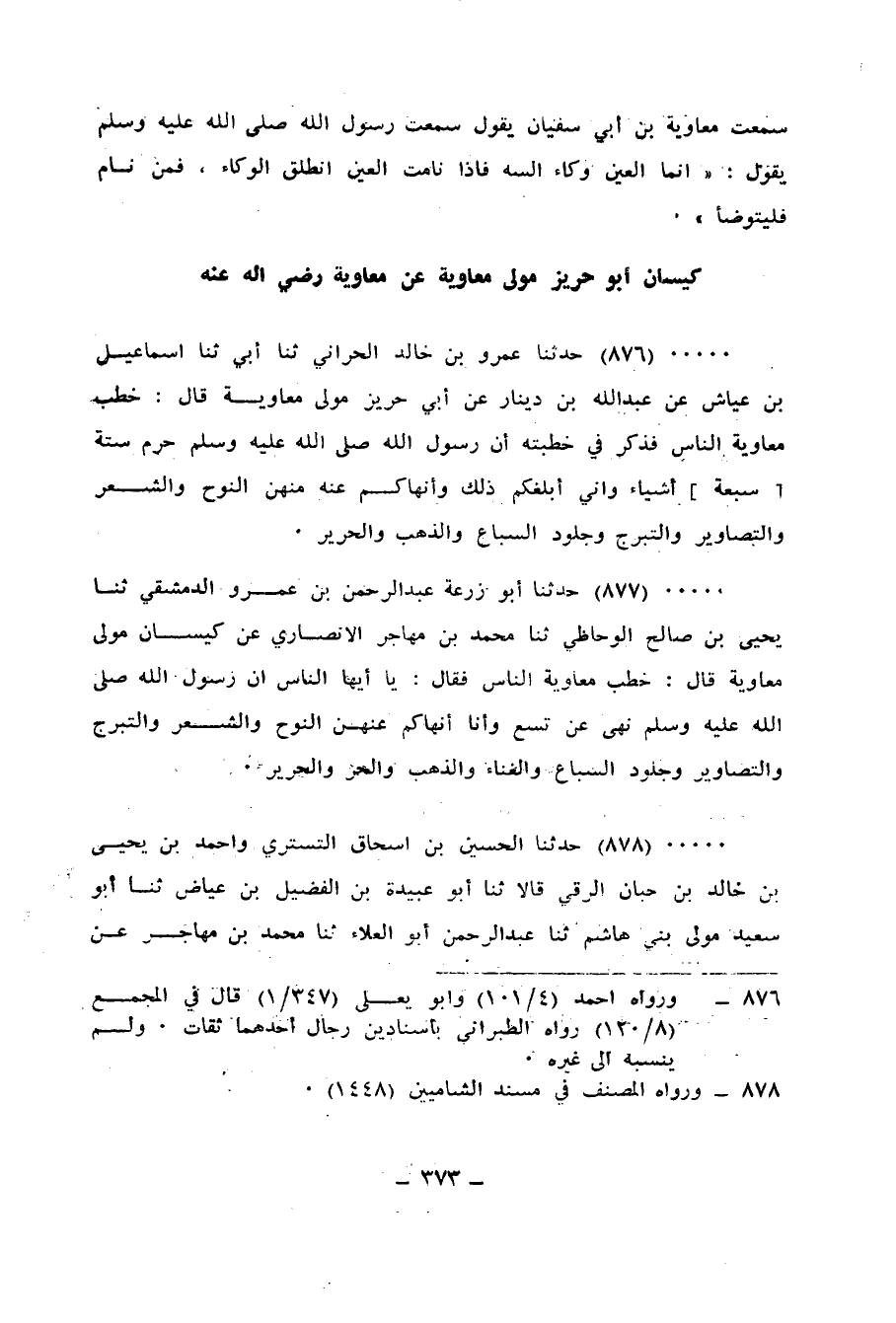 878 - حَدَّثَنَا الْحُسَيْنُ بْنُ إِسْحَاقَ التُّسْتَرِيُّ، وَأَحْمَدُ بْنُ يَحْيَى بْنِ خَالِدِ بْنِ حَبَّانَ الرَّقِّيُّ، قَالَا: ثنا أَبُو عُبَيْدَةَ بْنُ الْفُضَيْلِ بْنِ عِيَاضٍ، ثنا أَبُو سَعِيدٍ، مَوْلَى بَنِي هَاشِمٍ، ثنا عَبْدُ الرَّحْمَنِ أَبُو الْعَلَاءِ، ثنا مُحَمَّدُ بْنُ مُهَاجِرٍ، عَنْ كَيْسَانَ، مَوْلَى مُعَاوِيَةَ قَالَ: خَطَبَنَا مُعَاوِيَةُ فَقَالَ: " إِنَّ رَسُولَ اللهِ صَلَّى اللهُ عَلَيْهِ وَسَلَّمَ §نَهَى عَنْ تِسْعٍ، وَأَنَا أَنْهَاكُمْ عَنْهُنَّ، أَلَا إِنَّ مِنْهُنَّ: النَّوْحُ، وَالْغِنَاءُ، وَالتَّصَاوِيرُ، وَالشَّعْرُ، وَالذَّهَبُ، وَالْحَرُّ، وَالسُّرُوجُ، وَالْحَرِيرُ "