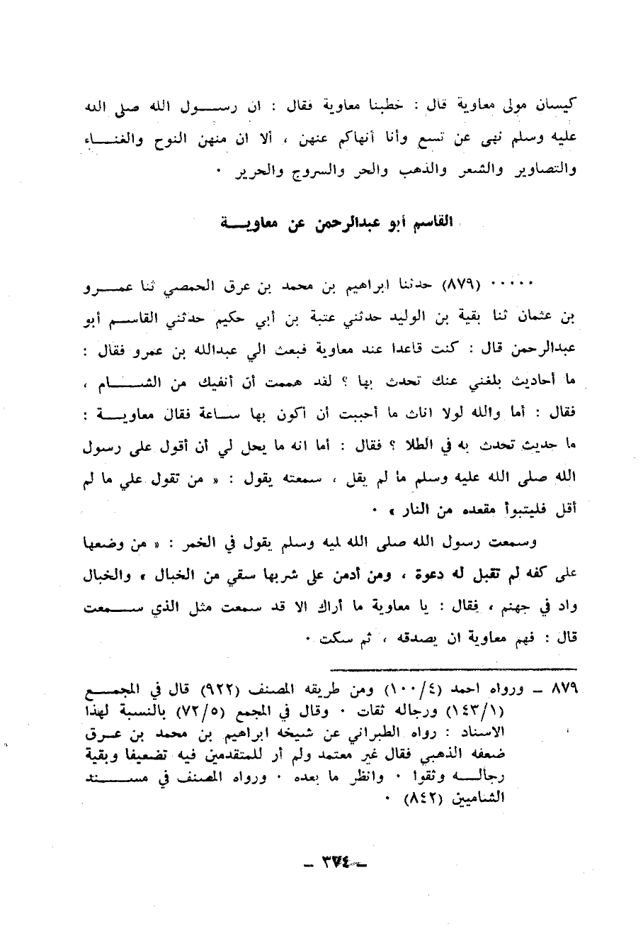 879 - حَدَّثَنَا إِبْرَاهِيمُ بْنُ مُحَمَّدِ بْنِ عِرْقٍ الْحِمْصِيُّ، ثنا عَمْرُو بْنُ عُثْمَانَ، ثنا بَقِيَّةُ بْنُ الْوَلِيدِ، حَدَّثَنِي عُتْبَةُ بْنُ أَبِي حَكِيمٍ، حَدَّثَنِي الْقَاسِمُ أَبُو عَبْدِ الرَّحْمَنِ، قَالَ: كُنْتُ قَاعِدًا عِنْدَ مُعَاوِيَةَ فَبَعَثَ إِلَى عَبْدِ اللهِ بْنِ عَمْرٍو، فَقَالَ: مَا أَحَادِيثُ بَلَغَنِي عَنْكَ تُحَدِّثُ بِهَا؟، لَقَدْ هَمَمْتُ أَنْ أَنْفِيَكَ مِنَ الشَّامِ، فَقَالَ: أَمَا وَاللهِ لَوْلَا إِنَاثٌ مَا أَحْبَبْتُ أَنْ أَكُونَ بِهَا سَاعَةً، فَقَالَ مُعَاوِيَةُ: مَا حَدِيثٌ تُحَدِّثُ بِهِ فِي الطِّلَا؟، فَقَالَ: أَمَا إِنَّهُ مَا يَحِلُّ لِي أَنْ أَقُولَ عَلَى رَسُولِ اللهِ صَلَّى اللهُ عَلَيْهِ وَسَلَّمَ مَا لَمْ يَقُلْ، سَمِعْتُهُ يَقُولُ: «§مَنْ تَقَوَّلَ عَلِيَّ مَا لَمْ أَقُلْ فَلْيَتَبَوَّأْ مَقْعَدَهُ مِنَ النَّارِ»