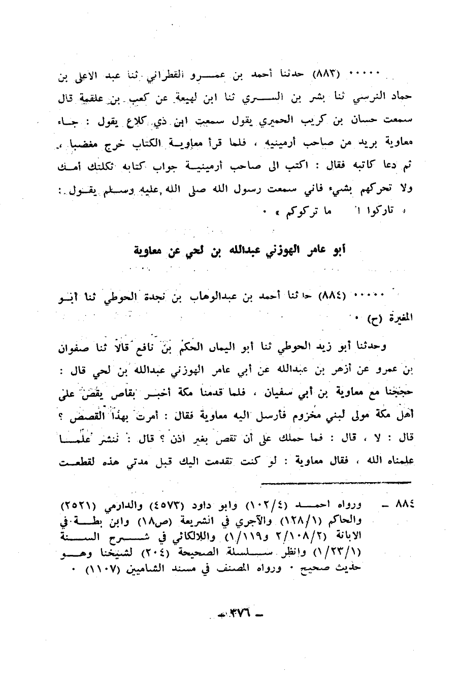 884 - حَدَّثَنَا أَحْمَدُ بْنُ عَبْدِ الْوَهَّابِ بْنِ نَجْدَةَ الْحَوْطِيُّ، ثنا أَبُو الْمُغِيرَةِ، ح وَحَدَّثَنَا أَبُو زَيْدٍ الْحَوْطِيُّ، ثنا أَبُو الْيَمَانِ الْحَكَمُ بْنُ نَافِعٍ، قَالَا: ثنا صَفْوَانُ بْنُ عَمْرٍو، عَنْ أَزْهَرَ بْنِ عَبْدِ اللهِ، عَنْ أَبِي عَامِرٍ الْهَوْزَنِيِّ عَبْدِ اللهِ بْنِ لُحَيٍّ، قَالَ: حَجَجْنَا مَعَ مُعَاوِيَةَ بْنِ أَبِي سُفْيَانَ، فَلَمَّا قَدِمْنَا مَكَّةَ أُخْبِرَ بِقَاصٍّ يَقُصُّ عَلَى أَهْلِ مَكَّةَ، مَوْلًى لِبَنِي مَخْزُومَ، فَأَرْسَلَ إِلَيْهِ مُعَاوِيَةُ، فَقَالَ: أُمِرْتَ بِهَذَا الْقَصَصِ؟، قَالَ: لَا، قَالَ: فَمَا حَمَلَكَ عَلَى أَنْ تَقُصَّ بِغَيْرِ إِذْنٍ؟، قَالَ: نَنْشُرُ عِلْمًا عَلَّمْنَاهُ اللهُ، فَقَالَ مُعَاوِيَةُ: لَوْ كُنْتُ تَقَدَّمْتُ إِلَيْكَ قَبْلَ مُدَّتِي هَذِهِ لَقَطَعْتُ مِنْكَ طَائِفًا، ثُمَّ قَامَ حَتَّى صَلَّى الظُّهْرَ بِمَكَّةَ، ثُمَّ قَالَ: إِنَّ رَسُولَ اللهِ صَلَّى اللهُ عَلَيْهِ وَسَلَّمَ قَالَ: «إِنَّ §أَهْلَ الْكِتَابِ افْتَرَقُوا عَلَى ثِنْتَيْنِ وَسَبْعِينَ مِلَّةً، وَإِنَّ هَذِهِ الْأُمَّةَ سَتَفْتَرُقُ عَلَى ثَلَاثٍ وَسَبْعِينَ مِلَّةً، يَعْنِي الْأَهْوَاءَ، وَكُلُّهَا فِي النَّارِ إِلَّا وَاحِدَةً وَهِيَ الْجَمَاعَةُ» ، وَقَالَ: «إِنَّهُ سَيَخْرُجُ مِنْ أُمَّتِي أَقْوَامٌ تَتَجَارَى بِهِمُ الْأَهْوَاءُ كَمَا يَتَجَارَى الْكَلْبُ بِصَاحِبِهِ، فَلَا يَبْقَى مِنْهُ عِرْقٌ وَلَا مَفْصِلٌ إِلَّا دَخَلَهُ» ، وَاللهِ يَا مَعْشَرَ الْعَرَبِ لَئِنْ لَمْ تَقُومُوا بِمَا جَاءَ بِهِ مُحَمَّدٌ صَلَّى اللهُ عَلَيْهِ وَسَلَّمَ لَغَيْرُكُمْ مِنَ النَّاسِ أَحْرَى أَنْ لَا يَقُومَ بِهِ
