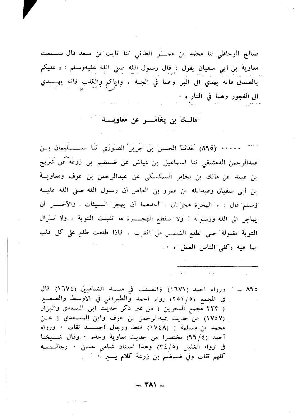 895 - حَدَّثَنَا الْحَسَنُ بْنُ جَرِيرٍ الصُّورِيُّ، ثنا سُلَيْمَانُ بْنُ عَبْدِ الرَّحْمَنِ الدِّمَشْقِيُّ، ثنا إِسْمَاعِيلُ بْنُ عَيَّاشٍ، عَنْ ضَمْضَمِ بْنِ زُرْعَةَ، عَنْ شُرَيْحِ بْنِ عُبَيْدٍ، عَنْ مَالِكِ بْنِ يَخَامِرَ السَّكْسَكِيِّ، عَنْ عَبْدِ الرَّحْمَنِ بْنِ عَوْفٍ، وَمُعَاوِيَةَ بْنِ أَبِي سُفْيَانَ، وَعَبْدِ اللهِ بْنِ عَمْرِو بْنِ الْعَاصِ، أَنَّ رَسُولَ اللهِ صَلَّى اللهُ عَلَيْهِ وَسَلَّمَ قَالَ: " §الْهِجْرَةُ هِجْرَتَانِ: أَحَدُهُمَا أَنْ يَهْجُرَ السَّيِّئَاتِ، وَالْأُخْرَى أَنْ يُهَاجِرَ إِلَى اللهِ وَرَسُولِهِ، وَلَا تَنْقَطِعُ الْهِجْرَةُ مَا تُقُبِّلَتِ التَّوْبَةُ، وَلَا تَزَالُ التَّوْبَةُ مَقْبُولَةً حَتَّى تَطْلُعَ الشَّمْسُ مِنَ المَغْرِبِ، فَإِذَا طَلَعَتْ طَلَعَ عَلَى كُلِّ قَلْبٍ بِمَا فِيهِ وَكَفَى النَّاسَ الْعَمَلَ "