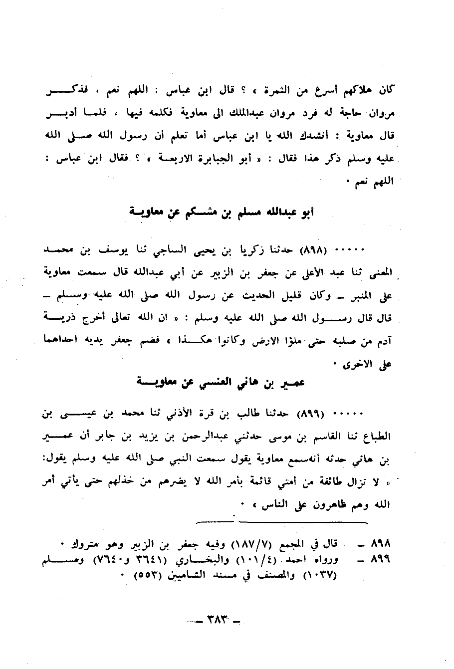 899 - حَدَّثَنَا طَالِبُ بْنُ قُرَّةَ الْأَذَنِيُّ، ثنا مُحَمَّدُ بْنُ عِيسَى بْنِ الطَّبَّاعِ، ثنا الْقَاسِمُ بْنُ مُوسَى، حَدَّثَنِي عَبْدُ الرَّحْمَنِ بْنُ يَزِيدَ بْنِ جَابِرٍ، أَنَّ عُمَيْرَ بْنَ هَانِئٍ، حَدَّثَهُ أَنَّهُ سَمِعَ مُعَاوِيَةَ، يَقُولُ: سَمِعْتُ النَّبِيَّ صَلَّى اللهُ عَلَيْهِ وَسَلَّمَ يَقُولُ: «§لَا تَزَالُ طَائِفَةٌ مِنْ أُمَّتِي قَائِمَةً بِأَمْرِ اللهِ لَا يَضُرُّهُمْ مَنْ خَذَلَهُمْ حَتَّى يَأْتِيَ أَمْرُ اللهِ وَهُمْ ظَاهِرُونَ عَلَى النَّاسِ»