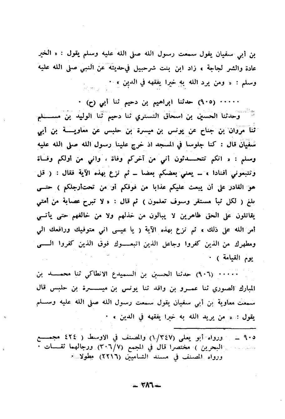 906 - حَدَّثَنَا الْحُسَيْنُ بْنُ السَّمَيْدَعِ الْأَنْطَاكِيُّ، ثنا مُحَمَّدُ بْنُ الْمُبَارَكِ الصُّورِيُّ، ثنا عَمْرُو بْنُ وَاقِدٍ، ثنا يُونُسُ بْنُ مَيْسَرَةَ بْنِ حَلْبَسَ قَالَ: سَمِعْتُ مُعَاوِيَةَ بْنَ أَبِي سُفْيَانَ، يَقُولُ: سَمِعْتُ رَسُولَ اللهِ صَلَّى اللهُ عَلَيْهِ وَسَلَّمَ يَقُولُ: «§مَنْ يُرِدِ اللهُ بِهِ خَيْرًا يُفَقِّهْهُ فِي الدِّينِ»