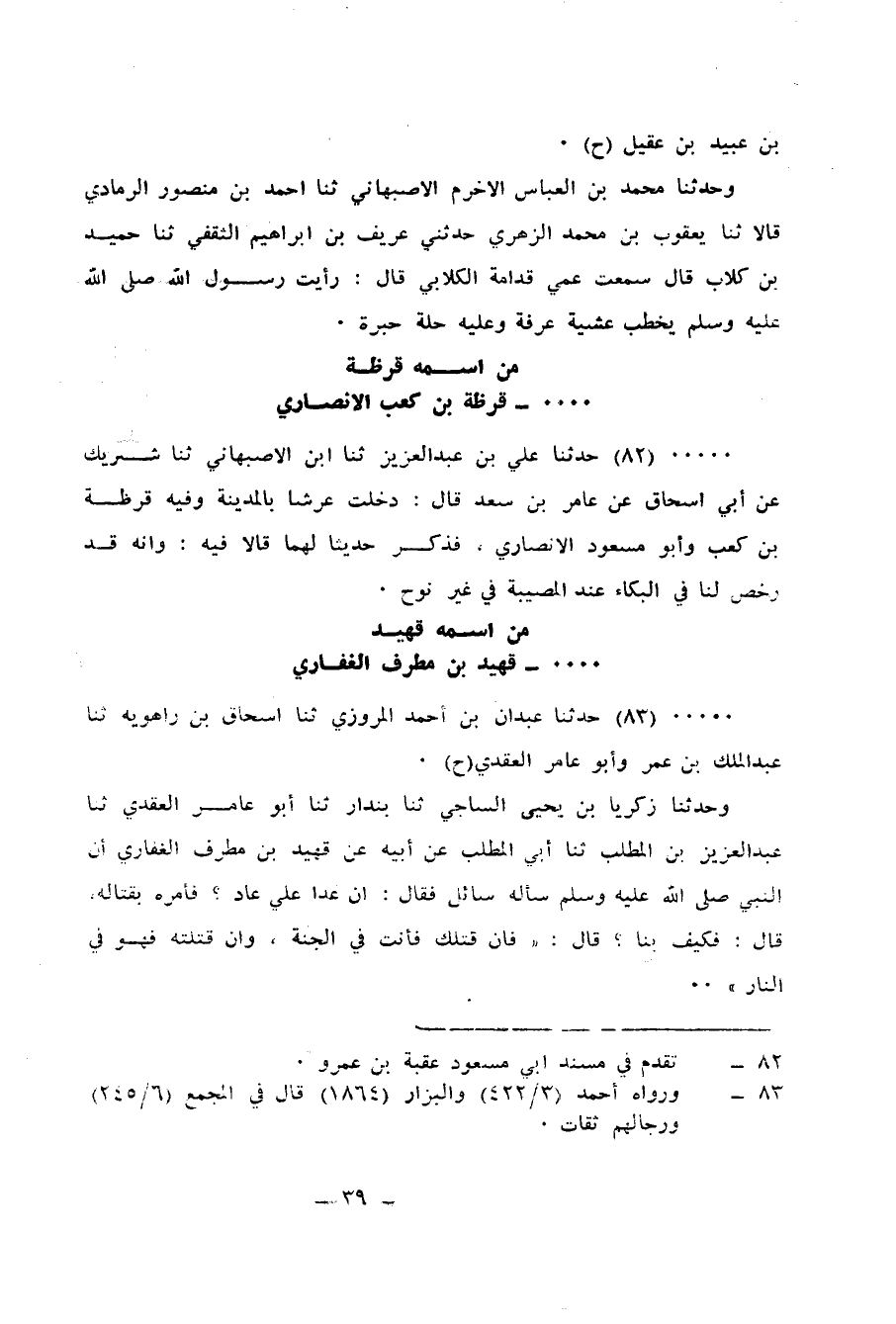 83 - حَدَّثَنَا عَبْدَانُ بْنُ أَحْمَدَ الْمَرْوَزِيُّ، ثنا إِسْحَاقُ بْنُ رَاهَوَيْهِ، ثنا عَبْدُ الْمَلِكِ بْنُ عُمَرَ، وَأَبُو عَامِرٍ الْعَقَدِيُّ، ح وَحَدَّثَنَا زَكَرِيَّا بْنُ يَحْيَى السَّاجِيُّ، ثنا بُنْدَارٌ، ثنا ُ أَبُو عَامِرٍ الْعَقَدِيُّ، ثنا عَبْدُ الْعَزِيزِ بْنُ الْمُطَّلِبِ، ثنا أَبِي الْمُطَّلِبُ، عَنْ أَبِيهِ، عَنْ قُهَيْدِ بْنِ مُطَرِّفٍ الْغِفَارِيُّ، أَنَّ النَّبِيَّ صَلَّى اللهُ عَلَيْهِ وَسَلَّمَ سَأَلَهُ سَائِلٌ، فَقَالَ: إِنْ §عَدَا عَلِيَّ عَادٍ، فَأَمَرَهُ بِقِتَالِهِ، قَالَ: فَكَيْفَ بِنَا؟، قَالَ: «فَإِنْ قَتَلَكَ فَأَنْتَ فِي الْجَنَّةِ، وَإِنْ قَتَلْتَهُ فَهُوَ فِي النَّارِ»