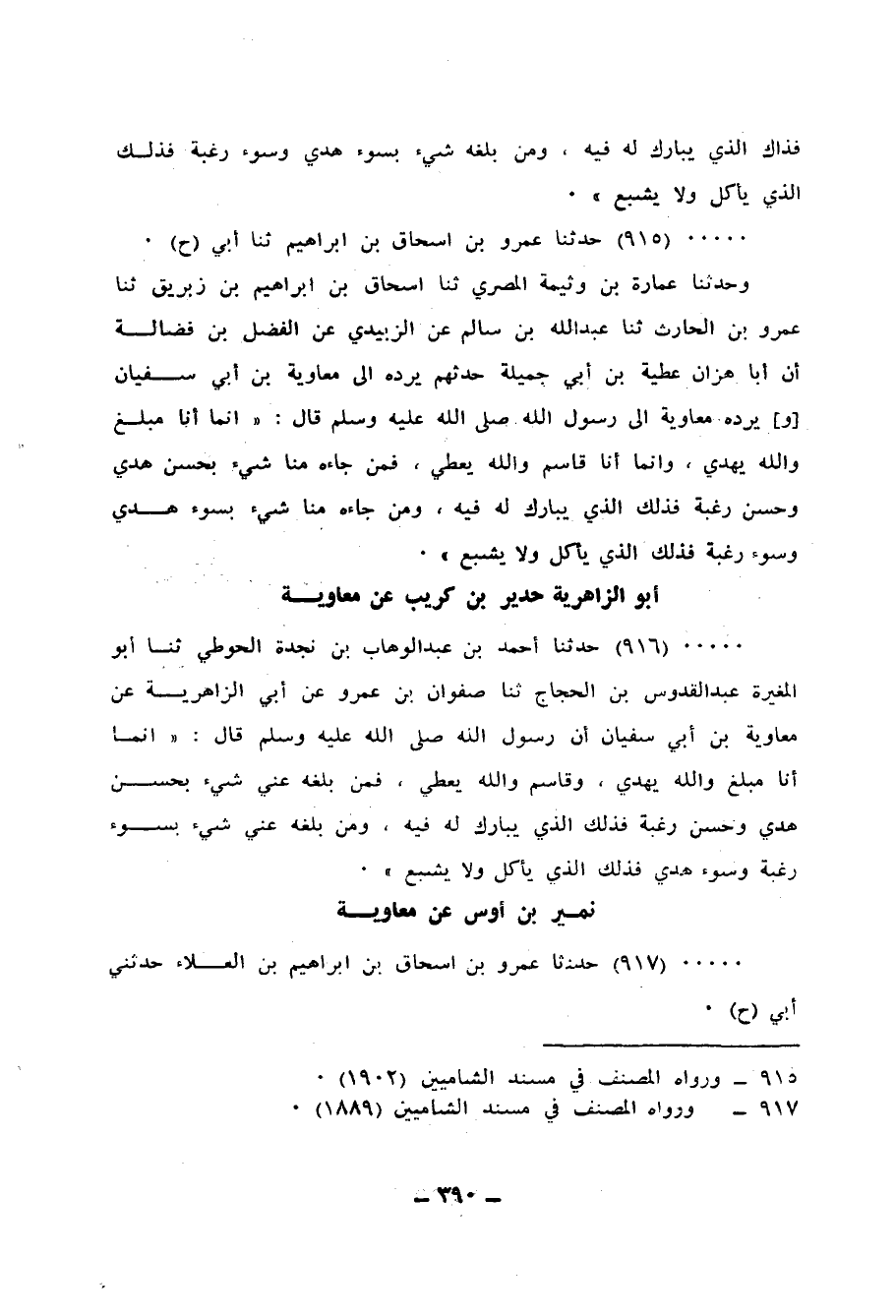 915 - حَدَّثَنَا عَمْرُو بْنُ إِسْحَاقَ بْنِ إِبْرَاهِيمَ، ثنا أَبِي، ح وَحَدَّثَنَا عُمَارَةُ بْنُ وَثِيمَةَ الْمِصْرِيُّ، ثنا إِسْحَاقُ بْنُ إِبْرَاهِيمَ بْنِ زِبْرِيقٍ، ثنا عَمْرُو بْنُ الْحَارِثِ، ثنا عَبْدُ اللهِ بْنُ سَالِمٍ، عَنِ الزُّبَيْدِيِّ، عَنِ الْفَضْلِ بْنِ فَضَالَةَ، أَنَّ أَبَا هَزَّانَ عَطِيَّةَ بْنَ أَبِي جَمِيلَةَ حَدَّثَهُمْ، يَرُدُّهُ إِلَى مُعَاوِيَةَ بْنِ أَبِي سُفْيَانَ، وَيَرُدُّهُ مُعَاوِيَةُ إِلَى رَسُولِ اللهِ صَلَّى اللهُ عَلَيْهِ وَسَلَّمَ، قَالَ: «إِنَّمَا §أَنَا مُبَلِّغٌ وَاللهُ يَهْدِي، وَإِنَّمَا أَنَا قَاسِمٌ وَاللهُ يُعْطِي، فَمَنْ جَاءَهُ مِنَّا شَيْءٌ بِحُسْنِ هَدْيٍ وَحُسْنِ رَغْبَةٍ فَذَلِكَ الَّذِي يُبَارَكُ لَهُ فِيهِ، وَمَنْ جَاءَهُ مِنَّا شَيْءٌ بِسُوءِ هَدْيٍ وَسُوءِ رَغْبَةٍ فَذَلِكَ الَّذِي يَأْكُلُ وَلَا يَشْبَعُ»