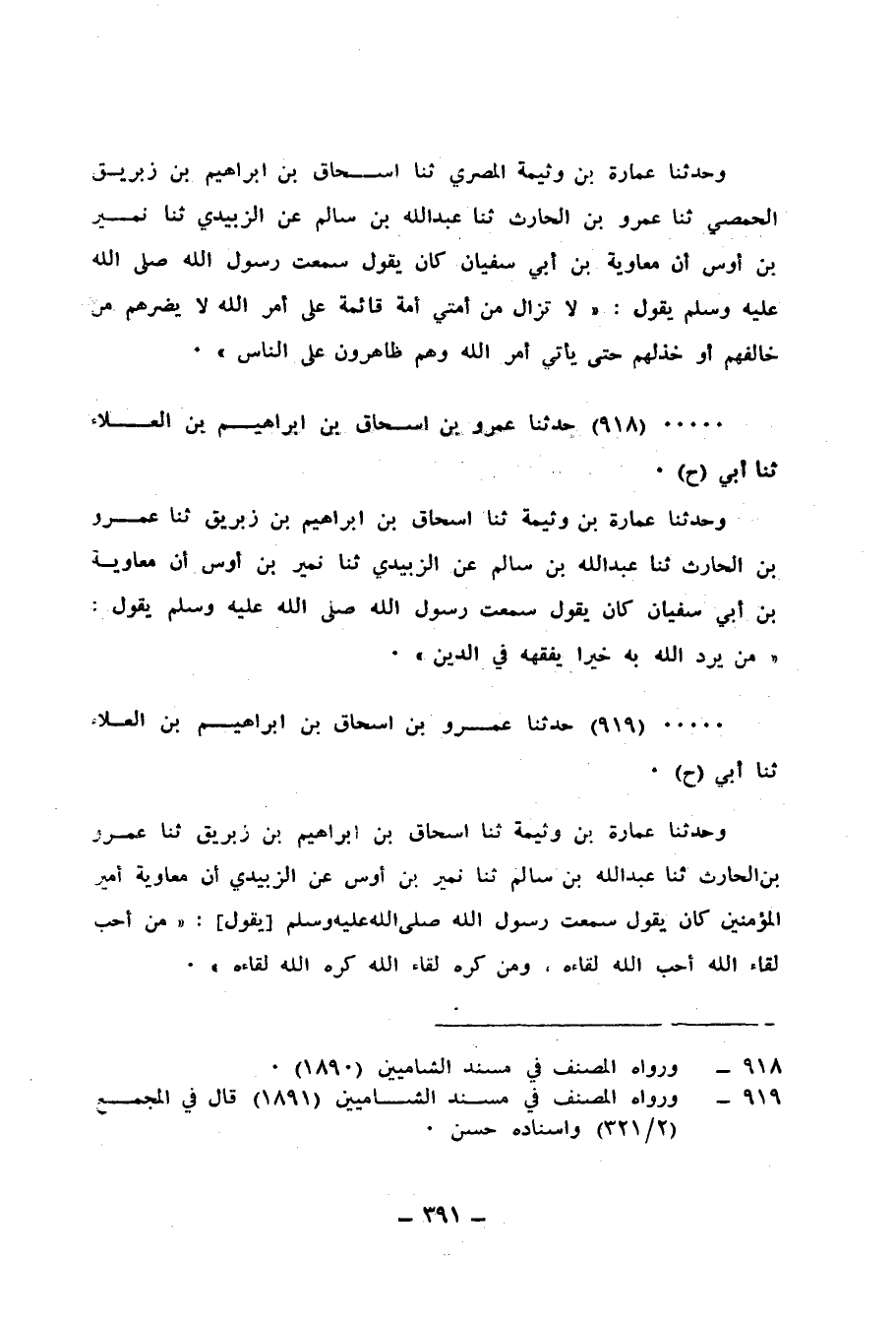 918 - حَدَّثَنَا عَمْرُو بْنُ إِسْحَاقَ بْنِ إِبْرَاهِيمَ بْنِ الْعَلَاءِ، ثنا أَبِي، ح وَحَدَّثَنَا عُمَارَةُ بْنُ وَثِيمَةَ، ثنا إِسْحَاقُ بْنُ إِبْرَاهِيمَ بْنِ زِبْرِيقٍ، ثنا عَمْرُو بْنُ الْحَارِثِ، ثنا عَبْدُ اللهِ بْنُ سَالِمٍ، عَنِ الزُّبَيْدِيِّ، ثنا نُمَيْرُ بْنُ أَوْسٍ، أَنَّ مُعَاوِيَةَ بْنَ أَبِي سُفْيَانَ، كَانَ يَقُولُ: سَمِعْتُ رَسُولَ اللهِ صَلَّى اللهُ عَلَيْهِ وَسَلَّمَ يَقُولُ: «§مَنْ يُرِدِ اللهُ بِهِ خَيْرًا يُفَقِّهْهُ فِي الدِّينِ»