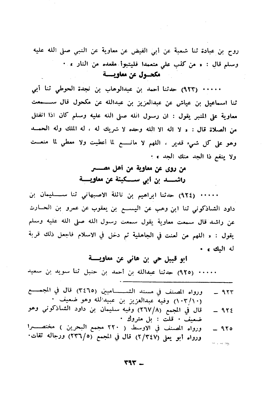 923 - حَدَّثَنَا أَحْمَدُ بْنُ عَبْدِ الْوَهَّابِ بْنِ نَجْدَةَ الْحَوْطِيُّ، ثنا أَبِي، ثنا إِسْمَاعِيلُ بْنُ عَيَّاشٍ، عَنْ عَبْدِ الْعَزِيزِ بْنِ عَبْدِ اللهِ، عَنْ مَكْحُولٍ، قَالَ: سَمِعْتُ مُعَاوِيَةَ، عَلَى الْمِنْبَرِ يَقُولُ: إِنَّ رَسُولَ اللهِ صَلَّى اللهُ عَلَيْهِ وَسَلَّمَ كَانَ §إِذَا انْفَتَلَ مِنَ الصَّلَاةِ، قَالَ: «لَا إِلَهَ إِلَّا اللهُ وَحْدَهُ لَا شَرِيكَ لَهُ، لَهُ الْمُلْكُ وَلَهُ الْحَمْدُ وَهُوَ عَلَى كُلِّ شَيْءٍ قَدِيرٌ، اللهُمَّ لَا مَانِعَ لِمَا أَعْطَيْتَ وَلَا مُعْطِيَ لِمَا مَنَعْتَ، وَلَا يَنْفَعُ ذَا الْجَدِّ مِنْكَ الْجَدُّ»