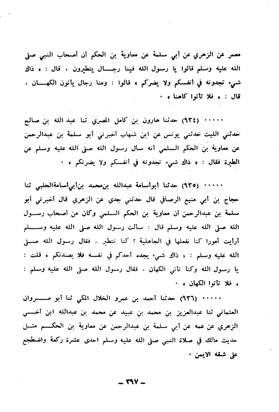 935 - حَدَّثَنَا أَبُو أُسَامَةَ عَبْدُ اللهِ بْنُ مُحَمَّدِ بْنِ أَبِي أُسَامَةَ الْحَلَبِيُّ، ثنا حَجَّاجُ بْنُ أَبِي مَنِيعٍ الرُّصَافِيُّ، قَالَ: حَدَّثَنِي جَدِّي، عَنِ الزُّهْرِيِّ، قَالَ: أَخْبَرَنِي أَبُو سَلَمَةَ بْنُ عَبْدِ الرَّحْمَنِ، أَنَّ مُعَاوِيَةَ بْنَ الْحَكَمِ السُّلَمِيَّ وَكَانَ مِنْ أَصْحَابِ رَسُولِ اللهِ صَلَّى اللهُ عَلَيْهِ وَسَلَّمَ، قَالَ: سَأَلْتُ رَسُولَ اللهِ صَلَّى اللهُ عَلَيْهِ وَسَلَّمَ: أَرَأَيْتَ أُمُورًا كُنَّا نَفْعَلُهَا فِي الْجَاهِلِيَّةِ؟، كُنَّا نَتَطَيَّرُ، فَقَالَ رَسُولُ اللهِ صَلَّى اللهُ عَلَيْهِ وَسَلَّمَ: «ذَاكَ شَيْءٌ يَجِدُهُ أَحَدُكُمْ فِي نَفْسِهِ، فَلَا يَصُدَّنَّكُمْ» ، قُلْتُ: يَا رَسُولَ اللهِ وَكُنَّا نَأْتِي الْكُهَّانَ، فَقَالَ رَسُولُ اللهِ صَلَّى اللهُ عَلَيْهِ وَسَلَّمَ: «§فلَا تَأْتُوا الْكُهَّانَ»