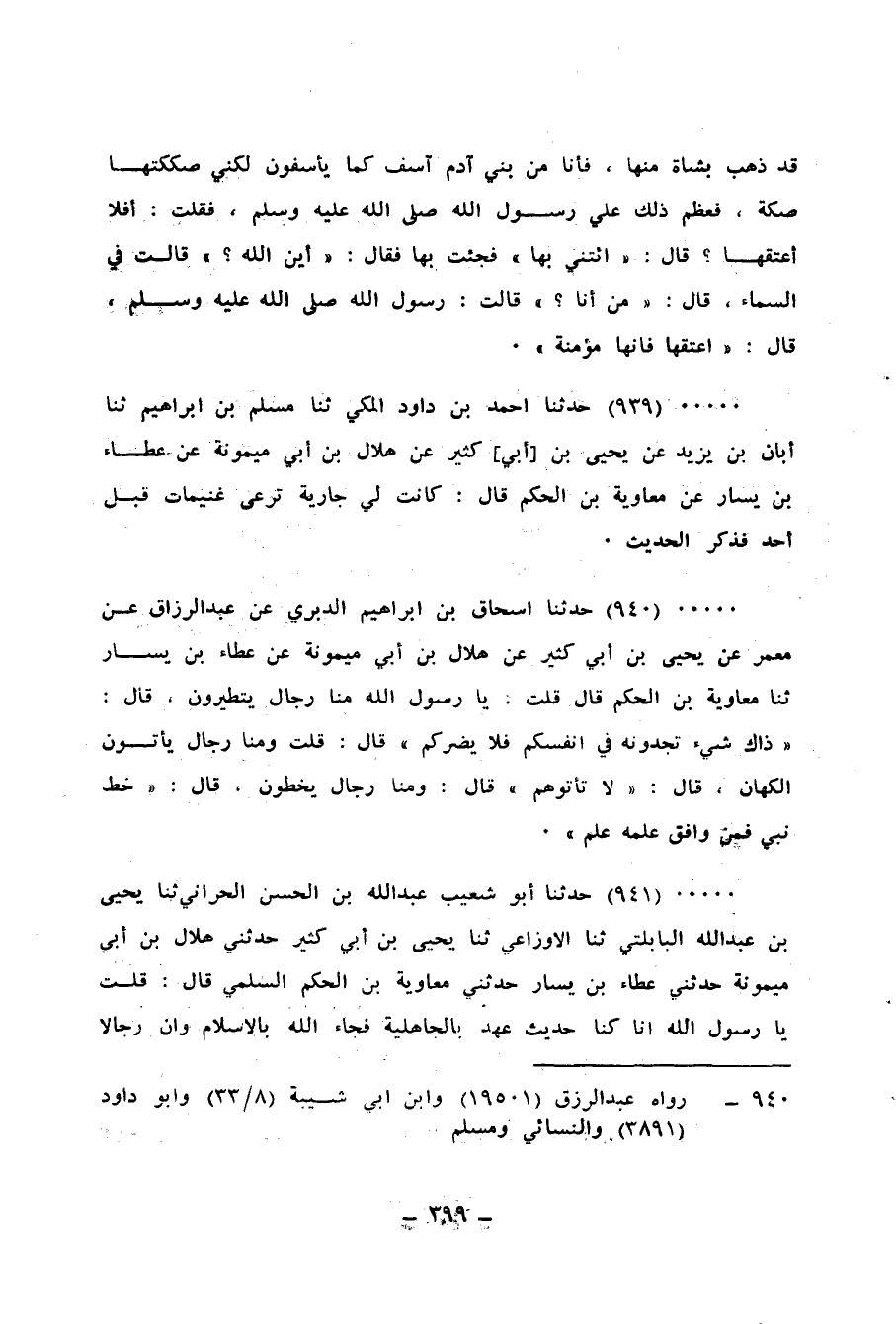 941 - حَدَّثَنَا أَبُو شُعَيْبٍ عَبْدُ اللهِ بْنُ الْحَسَنِ الْحَرَّانِيُّ، ثنا يَحْيَى بْنُ عَبْدِ اللهِ الْبَابْلُتِّيُّ، ثنا الْأَوْزَاعِيُّ، ثنا يَحْيَى بْنُ أَبِي كَثِيرٍ، حَدَّثَنِي هِلَالُ بْنُ أَبِي مَيْمُونَةَ، حَدَّثَنِي عَطَاءُ بْنُ يَسَارٍ، حَدَّثَنِي مُعَاوِيَةُ بْنُ الْحَكَمِ السُّلَمِيُّ، قَالَ: قُلْتُ: يَا رَسُولَ اللهِ إِنَّا كُنَّا حَدِيثَ عَهْدٍ بِالْجَاهِلِيَّةِ، فَجَاءَ اللهُ بِالْإِسْلَامِ وَإِنَّ §رِجَالًا مِنَّا يَتَطَيَّرُونَ، فَقَالَ: «ذَاكَ شَيْءٌ يَجِدُونَهُ فِي صُدُورِهِمْ فَلَا يَصُدَّنَّهُمْ» ، قَالَ: يَا رَسُولَ اللهِ وَرِجَالٌ مِنَّا يَأْتُونَ الْكُهَّاَنَ، قَالَ: «لَا، فَلَا تَأْتُوهُمْ» ، قَالَ: وَرِجَالٌ مِنَّا يَخُطُّونَ، قَالَ: «قَدْ كَانَ نَبِيُّ الْأَنْبِيَاءِ يَخُطُّ، فَمَنْ وَافَقَ خَطَّهُ فَذَاكَ»