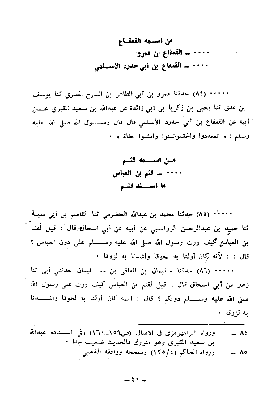 85 - حَدَّثَنَا مُحَمَّدُ بْنُ عَبْدِ اللهِ الْحَضْرَمِيُّ، ثنا الْقَاسِمُ بْنُ أَبِي شَيْبَةَ، ثنا حُمَيْدُ بْنُ عَبْدِ الرَّحْمَنِ الرَّوَاسِبِيُّ، عَنْ أَبِيهِ، عَنْ أَبِي إِسْحَاقَ، قَالَ: قِيلَ لِقُثَمَ بْنِ الْعَبَّاسِ: §كَيْفَ وَرِثَ رَسُولَ اللهِ صَلَّى اللهُ عَلَيْهِ وَسَلَّمَ عَلِيٌّ دُونَ الْعَبَّاسِ؟، قَالَ: «لِأَنَّهُ كَانَ أَوَّلَنَا بِهِ لُحُوقًا وَأَشَدَّنَا بِهِ لُزُوقًا»