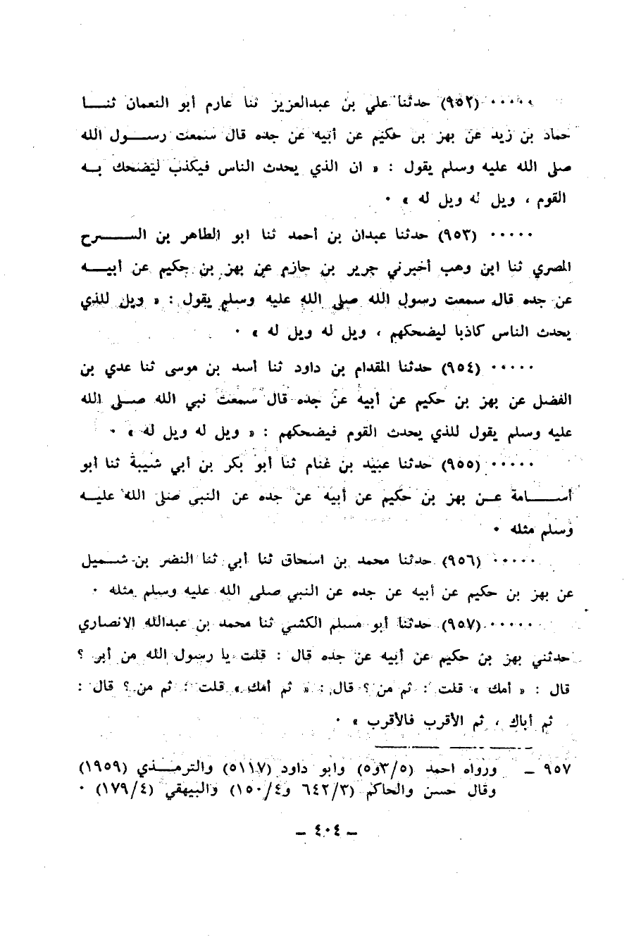 952 - حَدَّثَنَا عَلِيُّ بْنُ عَبْدِ الْعَزِيزِ، ثنا عَارِمٌ أَبُو النُّعْمَانِ، ثنا حَمَّادُ بْنُ زَيْدٍ، عَنْ بَهْزِ بْنِ حَكِيمٍ، عَنْ أَبِيهِ، عَنْ جَدِّهِ، قَالَ: سَمِعْتُ رَسُولَ اللهِ صَلَّى اللهُ عَلَيْهِ وَسَلَّمَ يَقُولُ: «إِنَّ §الَّذِي يُحَدِّثُ النَّاسَ فَيَكْذِبُ لِيُضْحِكَ بِهِ الْقَوْمَ وَيْلٌ لَهُ وَيْلٌ لَهُ»
