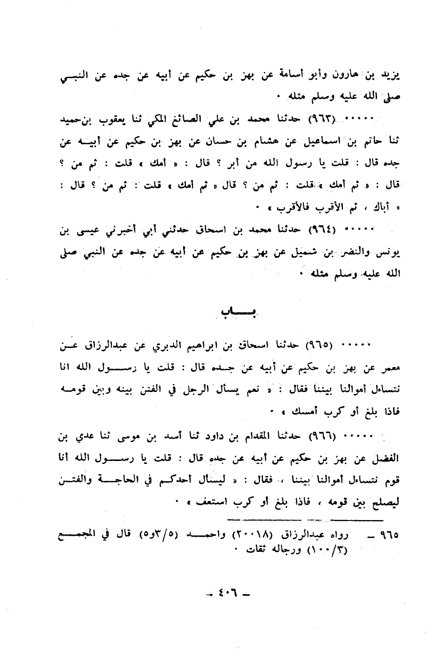 965 - حَدَّثَنَا إِسْحَاقُ بْنُ إِبْرَاهِيمَ الدَّبَرِيُّ، عَنْ عَبْدِ الرَّزَّاقِ، عَنْ مَعْمَرٍ، عَنْ بَهْزِ بْنِ حَكِيمٍ، عَنْ أَبِيهِ، عَنْ جَدِّهِ، قَالَ: قُلْتُ: يَا رَسُولَ اللهِ إِنَّا نَتَسَاءَلُ أَمْوَالَنَا بَيْنَنَا، فَقَالَ: «نَعَمْ، §يَسْأَلُ الرَّجُلُ فِي الْفِتَنِ بَيْنَهُ وَبَيْنَ قَوْمِهِ، فَإِذَا بَلَغَ أَوْ كَرَبَ أَمْسَكَ»