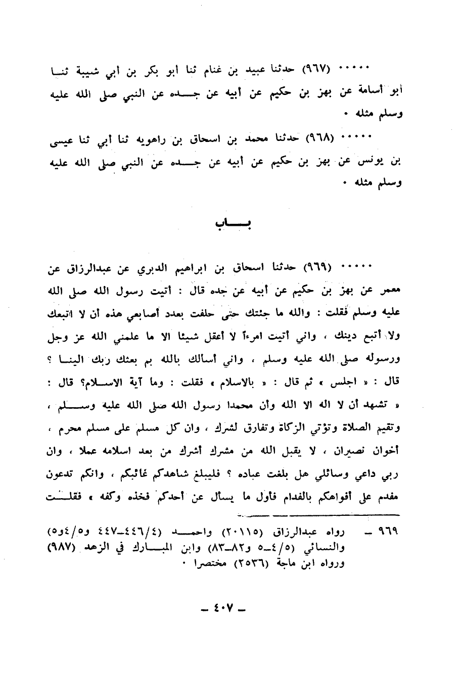 969 - حَدَّثَنَا إِسْحَاقُ بْنُ إِبْرَاهِيمَ الدَّبَرِيُّ، عَنْ عَبْدِ الرَّزَّاقِ، عَنْ مَعْمَرٍ، عَنْ بَهْزِ بْنِ حَكِيمٍ، عَنْ أَبِيهِ، عَنْ جَدِّهِ، قَالَ: أَتَيْتُ رَسُولَ اللهِ صَلَّى اللهُ عَلَيْهِ وَسَلَّمَ، فَقُلْتُ: وَاللهِ مَا جِئْتُكَ حَتَّى حَلَفْتُ بِعَدَدِ أَصَابِعِي هَذِهِ أَنْ لَا أَتَّبِعَكَ وَلَا أَتَّبِعَ دِينَكَ، وَإِنِّي أَتَيْتُ امْرَءًا لَا أَعْقِلُ شَيْئًا إِلَّا مَا عَلِّمْنِي اللهُ عَزَّ وَجَلَّ وَرَسُولُهُ صَلَّى اللهُ عَلَيْهِ وَسَلَّمَ، وَإِنِّي أَسْأَلُكَ بِاللهِ بِمَ بَعَثَكَ رَبُّكَ إِلَيْنَا؟، قَالَ: «اجْلِسْ» ، ثُمَّ قَالَ: «بِالْإِسْلَامِ» ، فَقُلْتُ: §وَمَا آيَةُ الْإِسْلَامِ؟، قَالَ: «تَشْهَدُ أَنْ لَا إِلَهَ إِلَّا اللهُ، وَأَنَّ مُحَمَّدًا رَسُولُ اللهِ صَلَّى اللهُ عَلَيْهِ وَسَلَّمَ، وَتُقِيمُ الصَّلَاةَ، وَتُؤْتِي الزَّكَاةَ، وَتُفَارِقُ الشِّرْكَ، وَإِنَّ كُلَّ مُسْلِمٍ عَلَى مُسْلِمٍ مُحَرَّمٌ، أَخَوَانِ نَصِيرَانِ، لَا يَقْبَلُ اللهُ مِنْ مُشْرِكٍ أَشْرَكَ مِنْ بَعْدِ إِسْلَامِهِ عَمَلًا، وَإِنَّ رَبِّي دَاعِيَّ وَسَائِلِي هَلْ بَلَغَتُ عِبَادَهُ؟، فَلْيُبَلِّغْ شَاهِدُكُمْ غَائِبَكُمْ، وَإِنَّكُمْ تُدْعَوْنَ مُفْدَمٌ عَلَى أَفْوَاهِكُمْ بِالْفِدَامِ، فَأَوَّلُ مَا يُسْأَلُ عَنْ أَحَدِكُمْ فَخِذُهُ وَكَفُّهُ» ، فَقُلْتُ: يَا رَسُولَ اللهِ وَهَذَا دِينُنَا؟، قَالَ: «نَعَمْ، فَإِنَّمَا تُحْشَرُونَ عَلَى وُجُوهِكُمْ وَعَلَى أَقْدَامِكُمْ وَرُكْبَانًا» -[408]-.