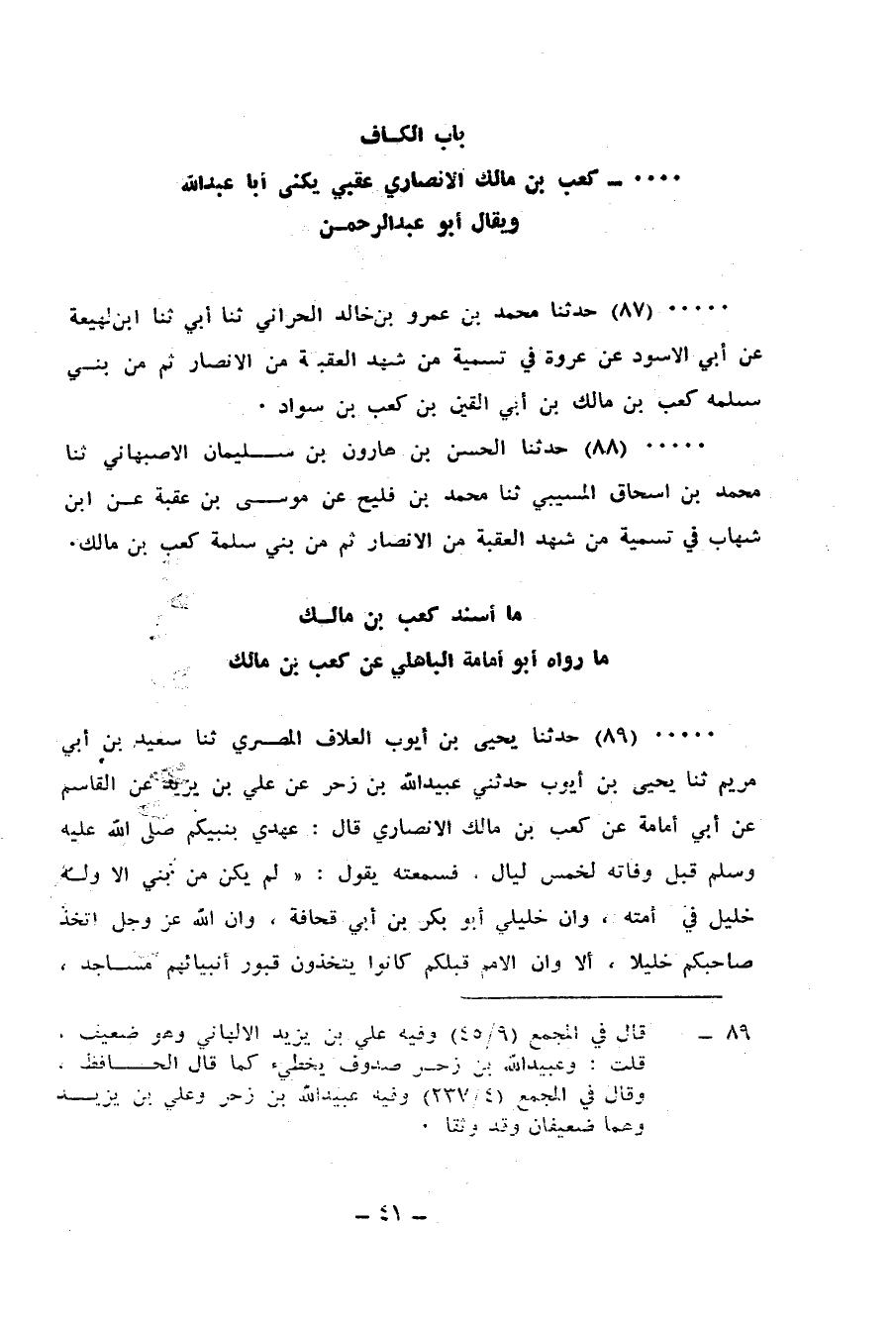 87 - حَدَّثَنَا مُحَمَّدُ بْنُ عَمْرِو بْنِ خَالِدٍ الْحَرَّانِيُّ، ثنا أَبِي، ثنا ابْنُ لَهِيعَةَ، عَنْ أَبِي الْأَسْوَدِ، عَنْ عُرْوَةِ: «فِي تَسْمِيَةِ» §مَنْ شَهِدَ الْعَقَبَةَ مِنَ الْأَنْصَارِ ثُمَّ مِنْ بَنِي سَلِمَةَ كَعْبُ بْنُ مَالِكِ بْنِ أَبِي الْقَيْنِ بْنِ كَعْبِ بْنِ سَوَّادٍ "