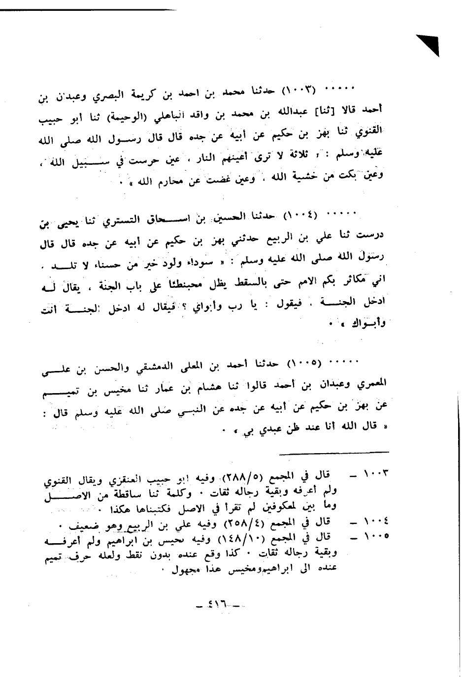 1003 - حَدَّثَنَا مُحَمَّدُ بْنُ أَحْمَدَ بْنِ كَرِيمَةَ الْبَصْرِيُّ، وَعَبْدَانُ بْنُ أَحْمَدَ، قَالَا: ثنا عَبْدُ اللهِ بْنُ مُحَمَّدِ بْنِ وَاقِدٍ الْبَاهِلِيُّ، الْوَحِيمَةُ، ثنا أَبُو حَبِيبٍ الْقَنَوِيُّ، ثنا بَهْزُ بْنُ حَكِيمٍ، عَنْ أَبِيهِ، عَنْ جَدِّهِ، قَالَ: قَالَ رَسُولُ اللهِ صَلَّى اللهُ عَلَيْهِ وَسَلَّمَ: " §ثَلَاثَةٌ لَا تَرَى أَعْيُنُهُمُ النَّارَ: عَيْنٌ حَرَسَتْ فِي سَبِيلِ اللهِ، وَعَيْنٌ بَكَتْ مِنْ خَشْيَةِ اللهِ، وَعَيْنٌ غَضَّتْ عَنْ مَحَارِمِ اللهِ "
