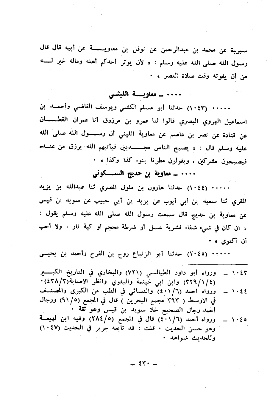 1044 - حَدَّثَنَا هَارُونُ بْنُ مَلُولٍ الْمِصْرِيُّ، ثنا عَبْدُ اللهِ بْنُ يَزِيدَ الْمُقْرِئُ، ثنا سَعِيدُ بْنُ أَبِي أَيُّوبَ، عَنْ يَزِيدَ بْنِ أَبِي حَبِيبٍ، عَنْ سُوَيْدِ بْنِ قَيْسٍ، عَنْ مُعَاوِيَةَ بْنِ حُدَيْجٍ، قَالَ: سَمِعْتُ رَسُولَ اللهِ صَلَّى اللهُ عَلَيْهِ وَسَلَّمَ، يَقُولُ: «§إِنْ كَانَ فِي شَيْءٍ شِفَاءٌ، فَشَرْبَةُ عَسَلٍ أَوْ شَرْطَةُ مِحْجَمٍ، أَوْ كَيَّةُ نَارٍ، وَلَا أُحِبُّ أَنْ أَكْتَوِيَ»