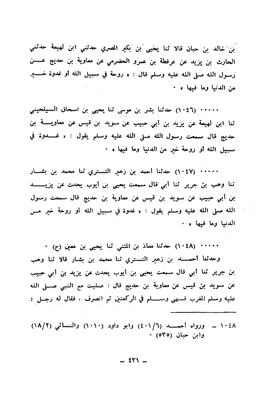 1046 - حَدَّثَنَا بِشْرُ بْنُ مُوسَى، ثنا يَحْيَى بْنُ إِسْحَاقَ السَّيْلَحِينِيُّ، ثنا ابْنُ لَهِيعَةَ، عَنْ يَزِيدَ بْنِ أَبِي حَبِيبٍ، عَنْ سُوَيْدِ بْنِ قَيْسٍ، عَنْ مُعَاوِيَةَ بْنِ حُدَيْجٍ، قَالَ: سَمِعْتُ رَسُولَ اللهِ صَلَّى اللهُ عَلَيْهِ وَسَلَّمَ يَقُولُ: «§غُدْوَةٌ فِي سَبِيلِ اللهِ، أَوْ رَوْحَةٌ خَيْرٌ مِنَ الدُّنْيَا وَمَا فِيهَا»