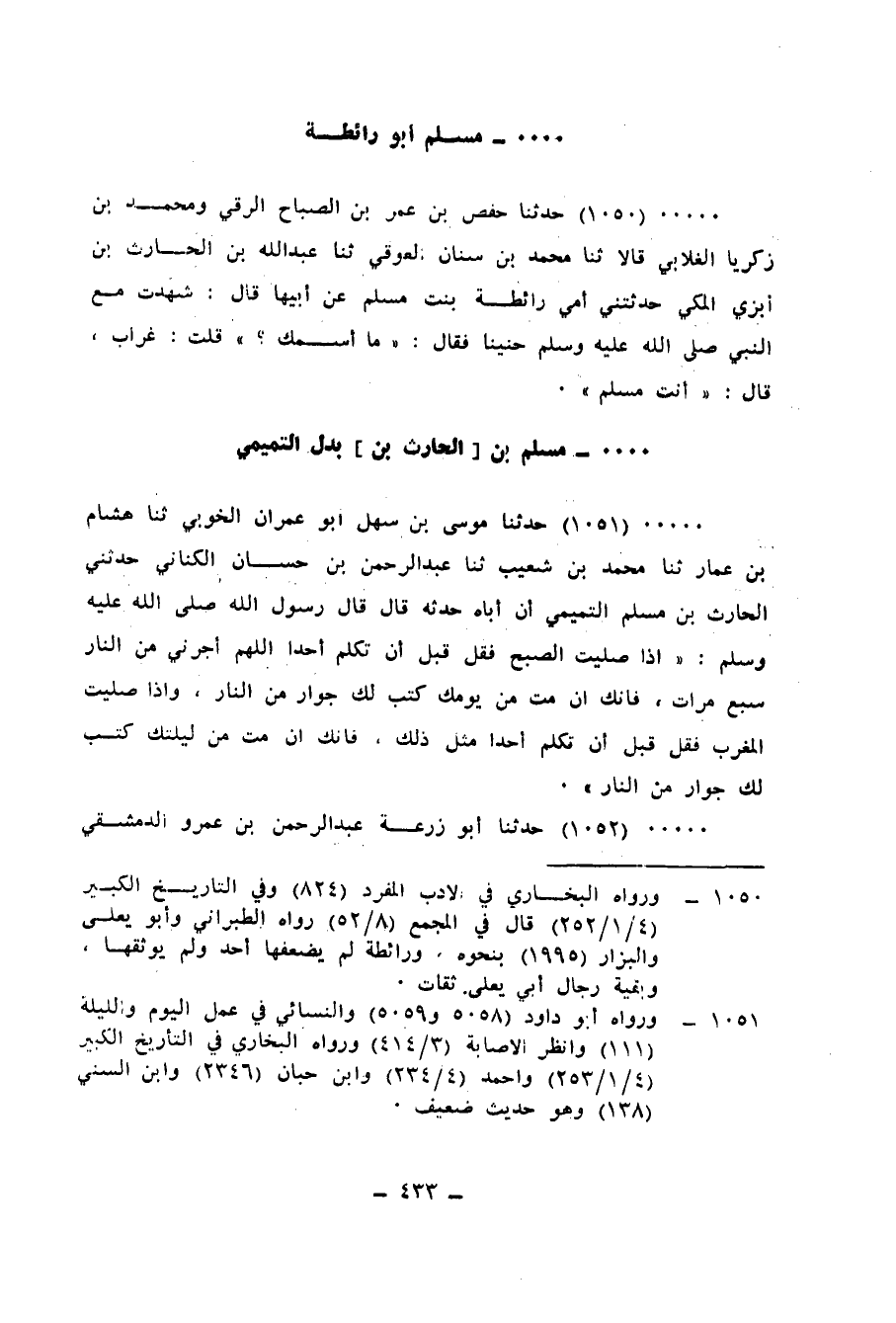 1052 - حَدَّثَنَا أَبُو زُرْعَةَ عَبْدُ الرَّحْمَنِ بْنُ عَمْرٍو الدِّمَشْقِيُّ، ثنا أَبُو مُسْهِرٍ، ح وَحَدَّثَنَا مُوسَى بْنُ هَارُونَ، ثنا الْحَكَمُ بْنُ مُوسَى، قَالَا: ثنا صَدَقَةُ بْنُ خَالِدٍ، عَنْ عَبْدِ الرَّحْمَنِ بْنِ حَسَّانٍ، ثنا الْحَارِثُ بْنُ مُسْلِمٍ التَّمِيمِيُّ، عَنْ أَبِيهِ، قَالَ: بَعَثَنَا رَسُولُ اللهِ صَلَّى اللهُ عَلَيْهِ وَسَلَّمَ فِي سَرِيَّةٍ، فَلَمَّا هَجَمْنَا عَلَى الْقَوْمِ تَقَدَّمْتُ أَصْحَابِي عَلَى فَرَسِي فَاسْتَقْبَلَنَا النِّسَاءُ وَالصِّبْيَانُ يَضِجُّونَ، فَقُلْتُ لَهُمْ: تُرِيدُونَ أَنْ تُحَرِّزُوا أَنْفُسَكُمْ؟، قَالُوا: نَعَمْ، قُلْتُ: قُولُوا: أَشْهَدُ أَنْ لَا إِلَهَ إِلَّا اللهُ، وَأَنَّ مُحَمَّدًا عَبْدُهُ وَرَسُولُهُ، فَقَالُوهَا، فَجَاءَ أَصْحَابِي فَلَامُونِي، فَقَالُوا: أَشْرَفْنَا عَلَى الْغَنِيمَةِ فَمَنَعْتَنَا، ثُمَّ انْصَرَفْنَا إِلَى رَسُولِ اللهِ صَلَّى اللهُ عَلَيْهِ وَسَلَّمَ، فَقَالَ: «مَا تَدْرُونَ مَا صَنَعَ؟، لَقَدْ كَتَبَ اللهُ لَهُ مِنْ كُلِّ إِنْسَانٍ كَذَا وَكَذَا مِنَ الْأَجْرِ» ، ثُمَّ أَدْنَانِي مِنْهُ، فَقَالَ: " §إِذَا صَلَّيْتَ صَلَاةَ الْغَدَاةِ فَقُلْ قَبْلَ أَنْ تُكَلِّمَ أَحَدًا: اللهُمَّ أَجِرْنِي مِنَ النَّارِ سَبْعَ مَرَّاتٍ، فَإِنَّكَ إِنْ مُتَّ مِنْ يَوْمِكَ ذَلِكَ كَتَبَ اللهُ لَكَ بِهَا جِوَارًا مِنَ النَّارِ، وَإِذَا صَلَّيْتَ الْمَغْرِبَ فَقُلْ قَبْلَ أَنْ تُكَلِّمَ أَحَدًا: اللهُمَّ أَجِرْنِي مِنَ النَّارِ سَبْعَ مَرَّاتٍ، فَإِنَّكَ إِنْ مُتَّ مِنْ لَيْلَتِكَ كَتَبَ اللهُ لَكَ جِوَارًا مِنَ النَّارِ "