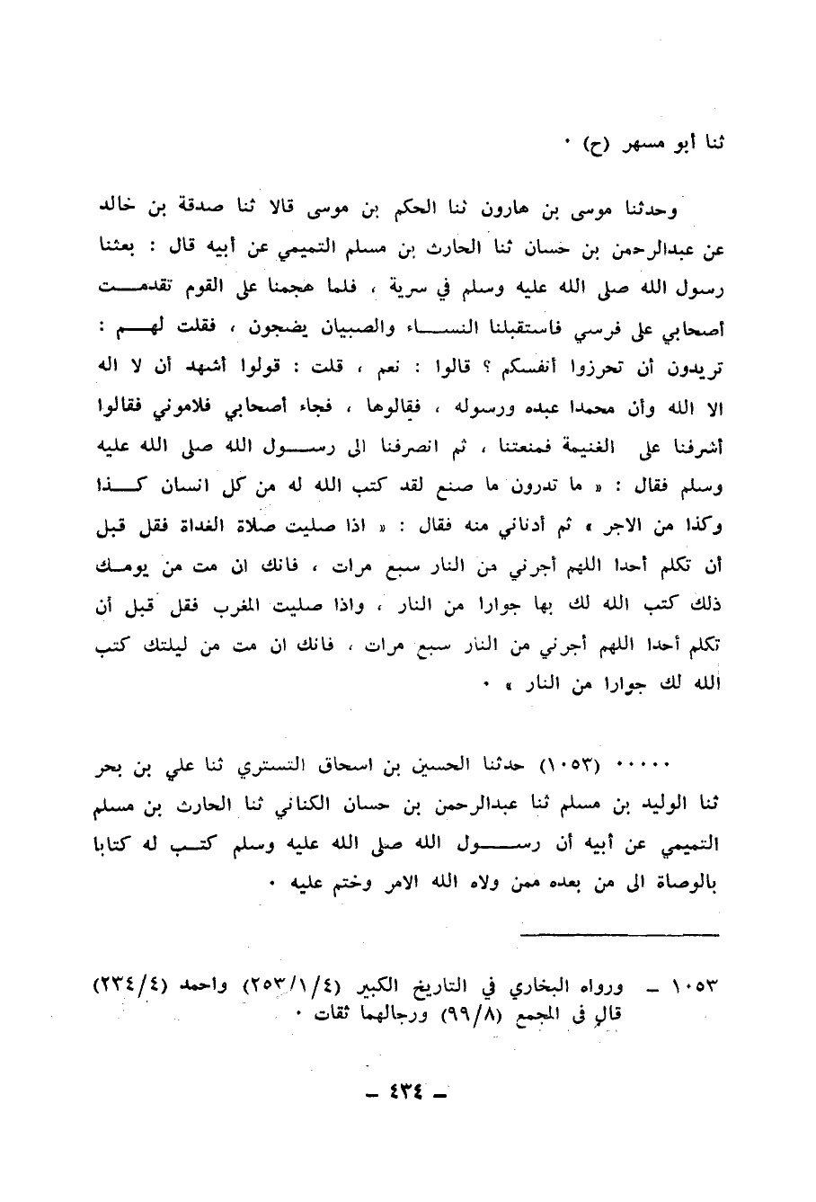 1053 - حَدَّثَنَا الْحُسَيْنُ بْنُ إِسْحَاقَ التُّسْتَرِيُّ، ثنا عَلِيُّ بْنُ بَحْرٍ، ثنا الْوَلِيدُ بْنُ مُسْلِمٍ، ثنا عَبْدُ الرَّحْمَنِ بْنُ حَسَّانٍ الْكِنَانِيُّ، ثنا الْحَارِثُ بْنُ مُسْلِمٍ التَّمِيمِيُّ، عَنْ أَبِيهِ،: «أَنَّ رَسُولَ اللهِ صَلَّى اللهُ عَلَيْهِ وَسَلَّمَ §كَتَبَ لَهُ كِتَابًا بِالْوَصَاةِ إِلَى مَنْ بَعْدَهُ مِمَّنْ وَلَّاهُ اللهُ الْأَمْرَ وَخَتَمَ عَلَيْهِ»
