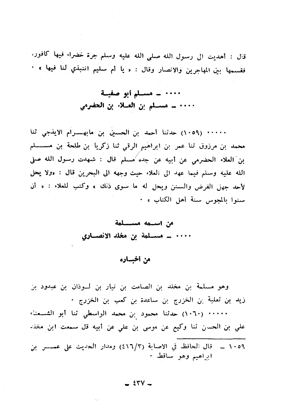 1059 - حَدَّثَنَا أَحْمَدُ بْنُ الْحُسَيْنِ بْنِ مَابِهْرَامَ الْأَيْذَجِيُّ، ثنا مُحَمَّدُ بْنُ مَرْزُوقٍ، ثنا عُمَرُ بْنُ إِبْرَاهِيمَ الرَّقِّيُّ، ثنا زَكَرِيَّا بْنُ طَلْحَةَ بْنِ مُسْلِمِ بْنِ الْعَلَاءِ الْحَضْرَمِيُّ، عَنْ أَبِيهِ، عَنْ جَدِّهِ مُسْلِمٍ، قَالَ: شَهِدْتُ رَسُولَ اللهِ صَلَّى اللهُ عَلَيْهِ وَسَلَّمَ فِيمَا عَهَدَ إِلَى الْعَلَاءِ حَيْثُ وَجَّهَهُ إِلَى الْبَحْرَيْنِ، قَالَ: «§وَلَا يَحِلُّ لِأَحَدٍ جَهْلُ الْفَرْضِ وَالسُّنَنِ، وَيَحِلُّ لَهُ مَا سِوَى ذَلِكَ» ، وَكَتَبَ للعلاءِ: «أَنْ سُنُّوا بِالْمَجُوسِ سُنَّةَ أَهْلِ الْكِتَابِ»
