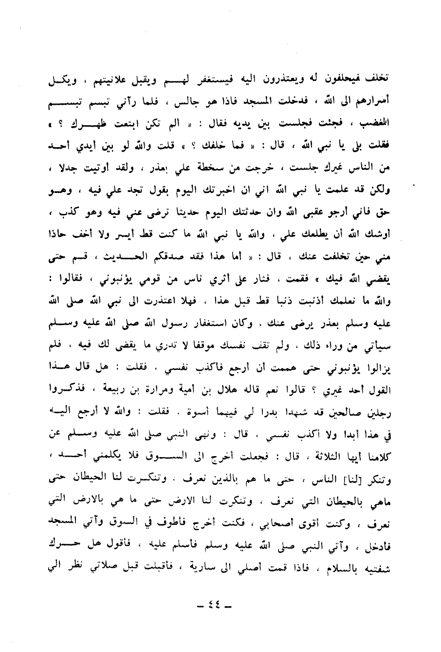 فَدَخَلْتُ الْمَسْجِدَ فَإِذَا هُوَ جَالِسٌ ، فَلَمَّا رَآنِي تَبَسَّمَ تَبَسُّمَ الْمُغْضَبِ ، فَجِئْتُ فَجَلَسْتُ بَيْنَ يَدَيْهِ ، فَقَالَ : أَلَمْ تَكُنِ ابْتَعْتَ ظَهْرَكَ ؟ فَقُلْتُ : بَلَى يَا نَبِيَّ اللهِ ، قَالَ : فَمَا خَلَفَكَ ؟ قُلْتُ : وَاللَّهِ لَوْ بَيْنَ أَيْدِي أَحَدٍ مِنَ النَّاسِ غَيْرِكَ جَلَسْتُ خَرَجْتُ مِنْ سَخْطَتِهِ عَلِيَّ بِعُذْرٍ ، وَلَقَدْ أُوتِيتُ جَدَلاً ، وَلَكِنْ قَدْ عَلِمْتُ يَا نَبِيَّ اللهِ أَنِّي إِنْ أَخْبَرْتُكَ الْيَوْمَ بِقَوْلٍ تَجِدُ عَلِيَّ فِيهِ وَهُوَ حَقٌّ ، فَإِنِّي أَرْجُو عُقْبَى اللهِ ، وَإِنْ حَدَّثْتُكَ الْيَوْمَ حَدِيثًا تَرْضَى عَنِّي فِيهِ وَهُوَ كَذِبٌ أَوْشَكَ اللَّهُ أَنْ يُطْلِعَكَ عَلَيَّ ، وَاللَّهِ يَا نَبِيَّ اللهِ مَا كُنْتُ قَطُّ أَيْسَرَ ، وَلاَ أَخَفَّ حَاذًا مِنِّي حِينَ تَخَلَّفْتُ عَنْكَ ، قَالَ : أَمَّا هَذَا فَقَدْ صَدَقَكُمُ الْحَدِيثَ ، قُمْ حَتَّى يَقْضِيَ اللَّهُ فِيكَ ، فَقُمْتُ فَثَارَ عَلَى أَثَرِي نَاسٌ مِنْ قَوْمِي يُؤَنِّبُونِي ، فَقَالُوا : وَاللَّهِ مَا نَعْلَمُكَ أَذْنَبْتَ ذَنْبًا قَطُّ قَبْلَ هَذَا ، فَهَلاَّ اعْتَذَرْتَ إِلَى نَبِيِّ اللهِ صَلَّى اللَّهُ عَلَيْهِ وَسَلَّمَ بِعُذْرٍ يَرْضَى عَنْكَ ، وَكَانَ اسْتِغْفَارُ رَسُولِ اللهِ صَلَّى اللَّهُ عَلَيْهِ وَسَلَّمَ سَيَأْتِي مِنْ وَرَاءِ ذَلِكَ ، وَلِمَ تَقِفُ نَفْسَكَ مَوْقِفًا لاَ تَدْرِي مَا يُقْضَى لَكَ فِيهِ ؟ فَلَمْ يَزَالُوا يُؤَنِّبُونِي حَتَّى هَمَمْتُ أَنْ أَرْجِعَ فَأُكَذِّبَ نَفْسِي ، فَقُلْتُ : هَلْ قَالَ هَذَا الْقَوْلَ أَحَدٌ غَيْرِي ؟ قَالُوا : نَعَمْ ، قَالَهُ هِلاَلُ بْنُ أُمَيَّةَ ، وَمَرَارَةُ بْنُ رَبِيعَةَ ، فَذَكَرُوا رَجُلَيْنِ صَالِحَيْنِ قَدْ شَهِدَا بَدْرًا ، لِي فِيهِمَا أُسْوَةٌ ، فَقُلْتُ : وَاللَّهِ لاَ أَرْجِعُ إِلَيْهِ فِي هَذَا أَبَدًا وَلاَ أُكَذِّبُ نَفْسِي ، قَالَ : وَنَهَى النَّبِيُّ صَلَّى اللَّهُ عَلَيْهِ وَسَلَّمَ عَنْ كَلاَمِنَا أَيُّهَا الثَّلاَثَةُ ، قَالَ : فَجَعَلْتُ أَخْرُجُ إِلَى السُّوقِ فَلاَ يُكَلِّمُنِي أَحَدٌ ، وَتَنَكَّرَ لَنَا النَّاسُ حَتَّى مَا هُمْ بِالَّذِينَ نَعْرِفُ ، وَتَنَكَّرَتْ لَنَا الْحِيطَانُ حَتَّى مَا هِيَ بِالْحِيطَانِ الَّتِي نَعْرِفُ ، وَتَنَكَّرَتْ لَنَا الأَرْضُ حَتَّى مَا هِيَ بِالأَرْضِ الَّتِي نَعْرِفُ ، وَكُنْتُ أَقْوَى أَصْحَابِي ، فَكُنْتُ أَخْرُجُ فَأَطُوفُ فِي السُّوقِ وَآتِي الْمَسْجِدَ فَأَدْخُلُ ، وَآتِي النَّبِيَّ صَلَّى اللَّهُ عَلَيْهِ وَسَلَّمَ فَأَقُولُ : هَلْ حَرَّكَ شَفَتَيْهِ بِالسَّلاَمِ ؟ فَإِذَا قُمْتُ أُصَلِّي إِلَى سَارِيَةٍ فَأَقْبَلْتُ قِبَلَ صَلاَتِي نَظَرَ إِلَيَّ بِمُؤَخَّرِ عَيْنَيْهِ ، وَإِذَا نَظَرْتُ إِلَيْهِ أَعْرَضَ عَنِّي ،