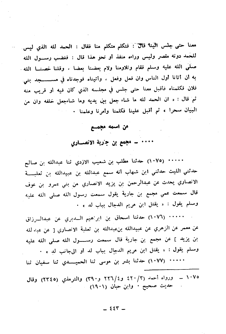 1075 - حَدَّثَنَا مُطَّلِبُ بْنُ شُعَيْبٍ الْأَزْدِيُّ، ثنا عَبْدُ اللهِ بْنُ صَالِحٍ، حَدَّثَنِي اللَّيْثُ، حَدَّثَنِي ابْنُ شِهَابٍ، أَنَّهُ سَمِعَ عَبْدَ اللهِ بْنَ عُبَيْدِ اللهِ بْنِ ثَعْلَبَةَ الْأَنْصَارِيَّ، يُحَدِّثُ عَنْ عَبْدِ الرَّحْمَنِ بْنِ يَزِيدَ الْأَنْصَارِيِّ، مِنْ بَنِي عَمْرِو بْنِ عَوْفٍ، قَالَ: سَمِعْتُ عَمِّي مُجَمِّعَ بْنَ جَارِيَةَ، يَقُولُ: سَمِعْتُ رَسُولَ اللهِ صَلَّى اللهُ عَلَيْهِ وَسَلَّمَ يَقُولُ: «§يَقْتُلُ ابْنُ مَرْيَمَ الدَّجَّالَ بِبَابِ لُدٍّ»