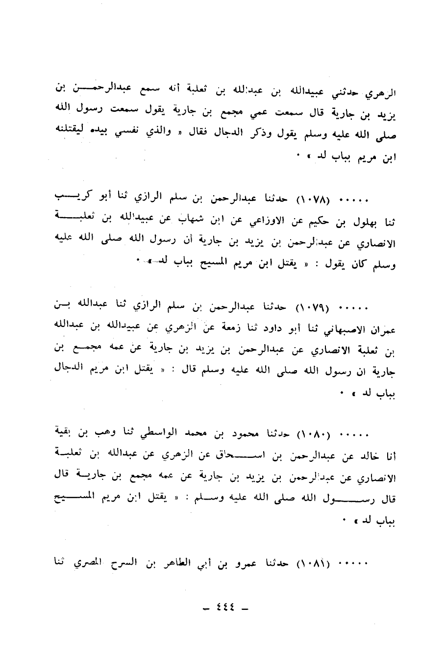 1077 - حَدَّثَنَا بِشْرُ بْنُ مُوسَى، ثنا الْحُمَيْدِيُّ، ثنا سُفْيَانُ، ثنا الزُّهْرِيُّ، حَدَّثَنِي عُبَيْدُ اللهِ بْنُ عَبْدِ اللهِ بْنِ ثَعْلَبَةَ، أَنَّهُ سَمِعَ عَبْدَ الرَّحْمَنِ بْنَ يَزِيدَ بْنِ جَارِيَةَ قَالَ: سَمِعْتُ عَمِّي مُجَمِّعِ بْنِ جَارِيَةَ يَقُولُ: سَمِعْتُ رَسُولَ اللهِ صَلَّى اللهُ عَلَيْهِ وَسَلَّمَ يَقُولُ، وَذَكَرَ الدَّجَّالَ، فَقَالَ: «وَالَّذِي نَفْسِي بِيَدِهِ §لَيَقْتُلَنَّهُ ابْنُ مَرْيَمَ بِبَابِ لُدٍّ»